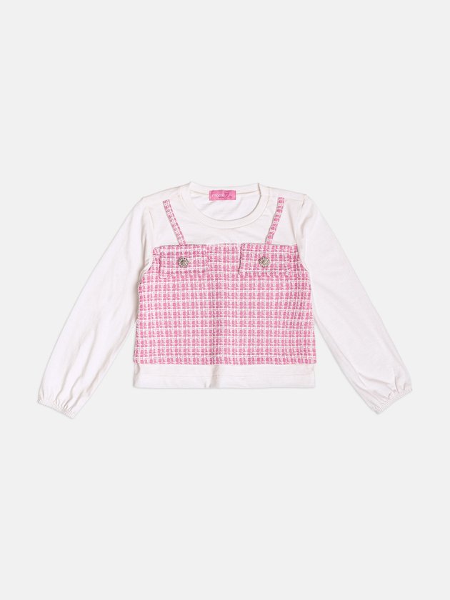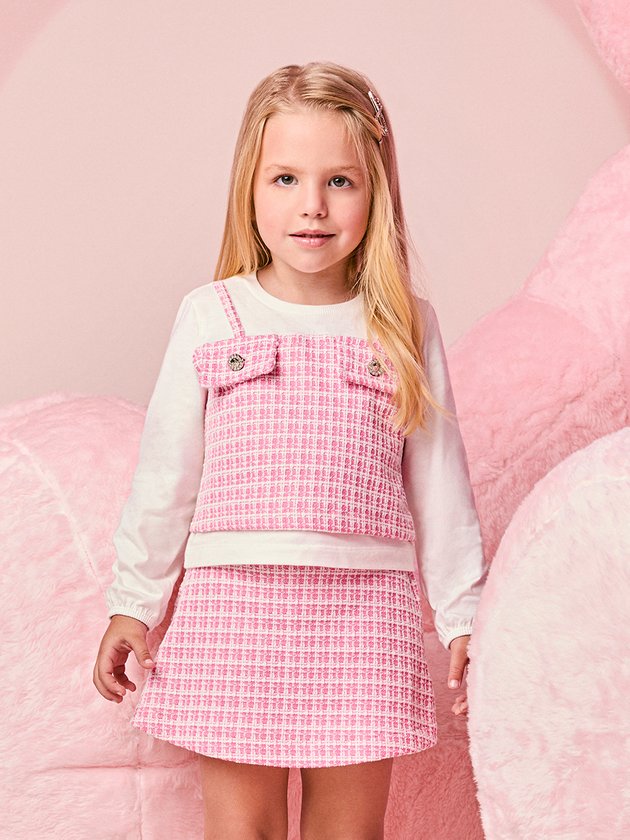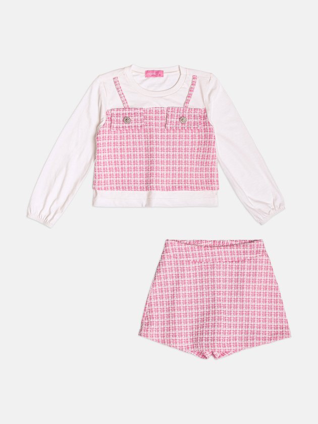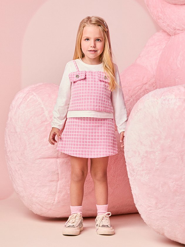 O Conjunto Infantil Manga Longa em Tweed Rosa traz uma proposta atual e cheia de estilo, perfeita para quem ama um visual arrumadinho sem perder o conforto. A parte superior simula sobreposição com efeito de jardineira em tweed rosa, adicionando textura e modernidade ao look. O tecido macio da manga longa garante bem-estar durante todo o uso, enquanto os bolsos decorativos com botões dão um toque sofisticado. O short-saia em tweed repete a padronagem e garante praticidade para correr, brincar e aproveitar qualquer momento. É um conjunto versátil, elegante e funcional, ideal para passeios, eventos e produções cheias de personalidade.