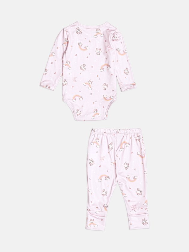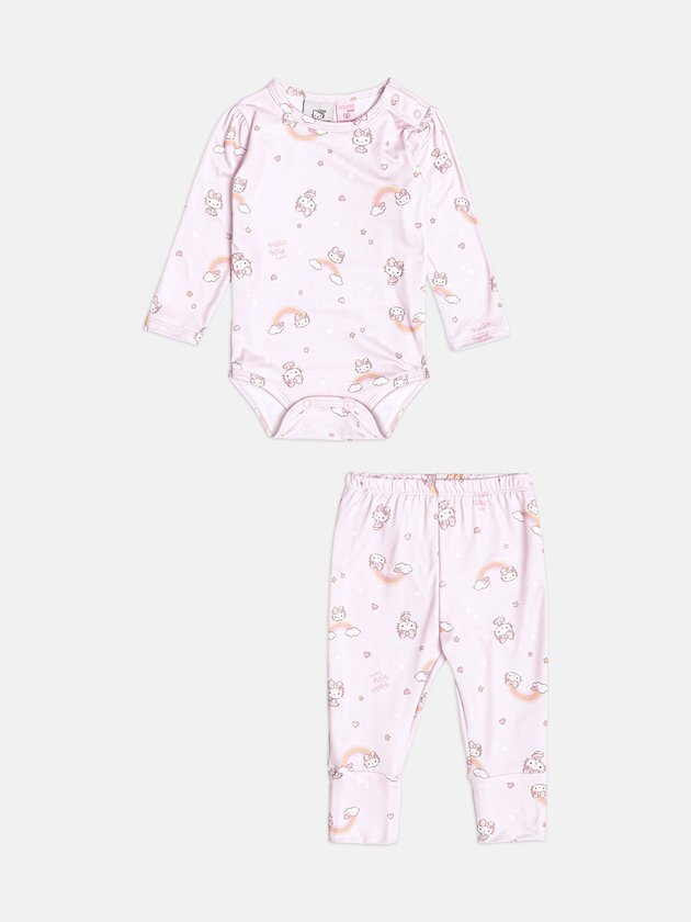 O Conjunto Infantil Rosa da Hello Kitty Momi é perfeito para as pequenas que amam conforto e fofura. Com estampa exclusiva da Hello Kitty e seus amigos, o look traz body de mangas longas e calça combinando, ambos em malha suave e macia. Um conjunto delicado e aconchegante, ideal para o dia a dia da bebê com muito estilo e ternura. Ref.: C2835