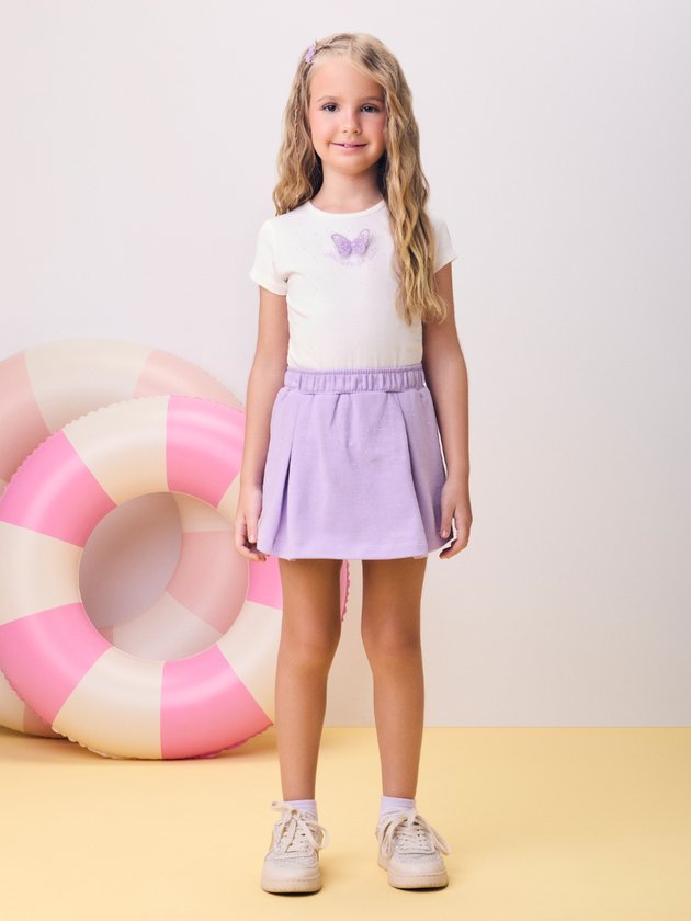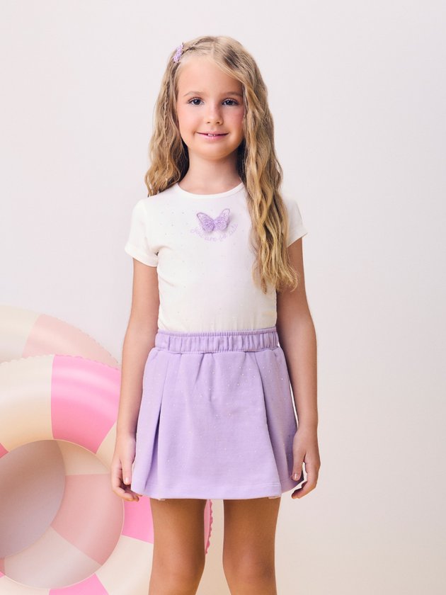 Um look que une leveza e muito charme! A blusa lilás traz patch de borboleta bordado no centro, com detalhes em strass que iluminam a peça. O short, também em lilás, tem modelagem soltinha, cós elástico e acabamento delicado. Ideal para um visual romântico, moderno e cheio de personalidade.