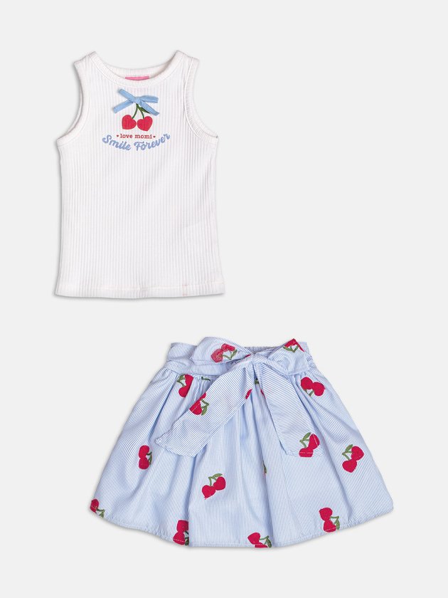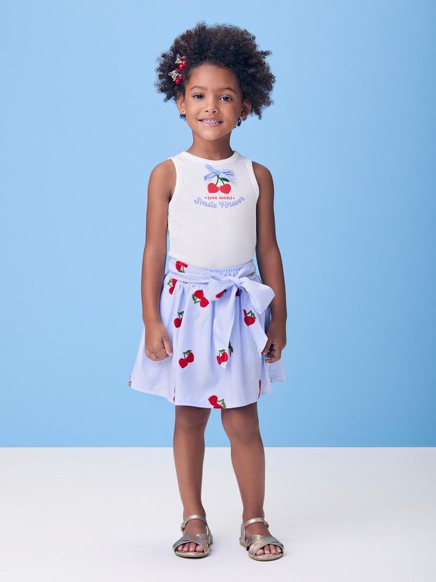 Com mood retrô e super atual, o conjunto listrado com cerejinhas bordadas é puro encanto. O lacinho aplicado na saia adiciona um detalhe delicado que destaca a peça. As listras acompanham a tendência navy da temporada, resultando em um look divertido e cheio de estilo.