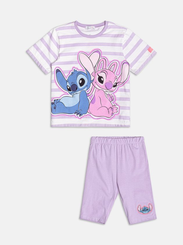 Um look divertido, fresco e cheio de atitude! A camiseta traz estampa do Stitch e da Angel sobre listras lilás e brancas, criando uma proposta descontraída e super charmosa. O short liso, em tom lilás suave, equilibra o visual e oferece muito conforto com sua modelagem soltinha e cós elástico. Um conjunto perfeito para quem ama looks coordenados e divertidos. Ref.: H6614