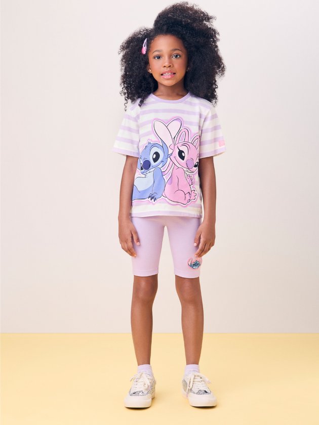 Um look divertido, fresco e cheio de atitude! A blusa traz estampa do Stitch e da Angel sobre listras lilás e brancas, criando uma proposta descontraída e super charmosa. O short liso, em tom lilás suave, equilibra o visual e oferece muito conforto com sua modelagem soltinha e cós elástico. Um conjunto perfeito para quem ama looks coordenados e divertidos.