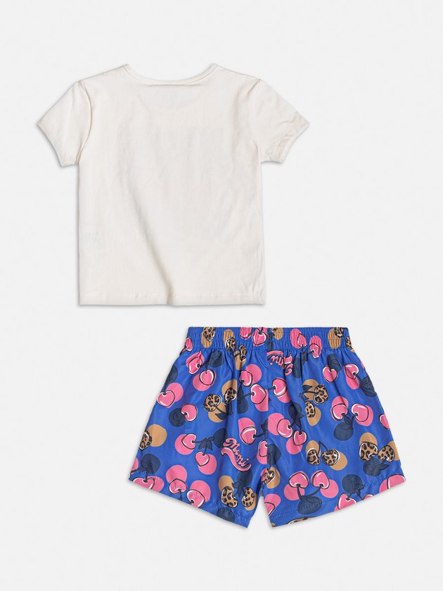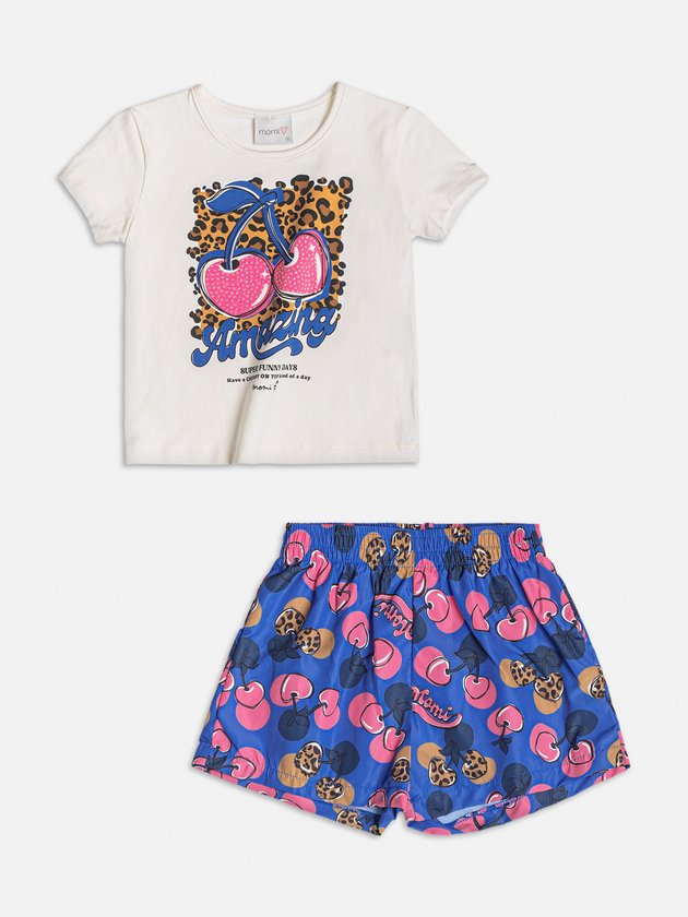 O conjunto de blusa e shorts com estampa de poá e cerejas é divertido e confortável. Confeccionado em tecido leve, é perfeito para o verão. A estampa de poá com cerejas adiciona um toque alegre ao visual, ideal para brincar e se divertir ao ar livre. Ref.: H5393