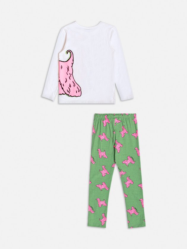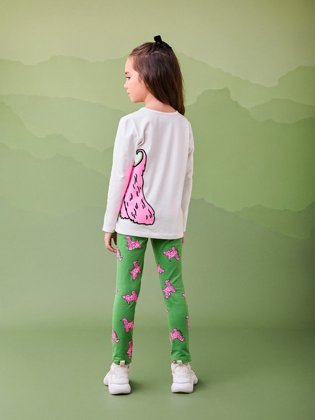 Este conjunto confortável e moderno é perfeito para meninas que amam se expressar com estilo. A blusa de manga longa, em tom branco, destaca um adorável dog pink com o texto "Made with love Momi", enquanto a legging verde traz a mesma estampa divertida de cachorrinhos, criando um visual alegre e cheio de energia. Ideal para atividades do dia a dia, com muito conforto e diversão. Ref.: H6564