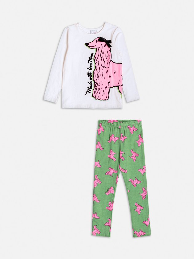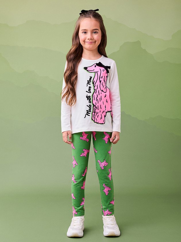 Este conjunto confortável e moderno é perfeito para meninas que amam se expressar com estilo. A blusa de manga longa, em tom branco, destaca um adorável dog pink com o texto "Made with love Momi", enquanto a legging verde traz a mesma estampa divertida de cachorrinhos, criando um visual alegre e cheio de energia. Ideal para atividades do dia a dia, com muito conforto e diversão.