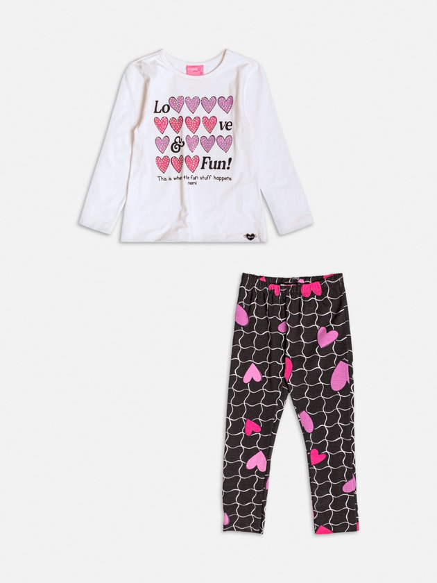 Este para um visual moderno e romântico, o conjunto de blusa off white e legging com estampa grid e corações é a escolha perfeita. A estampa de corações na parte superior combina com os elementos gráficos da calça, criando um look harmônico, divertido e ideal para os dias de outono-inverno. Ref.: J6543