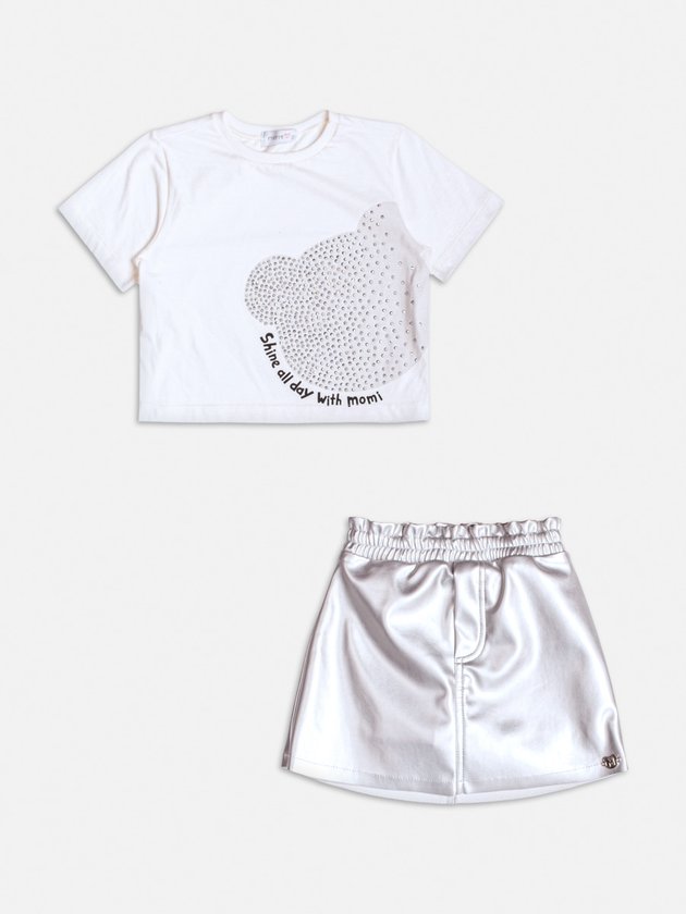 Este conjunto metalizado com estampa de urso e detalhes em strass é perfeito para brilhar em qualquer ocasião! Combinando um visual moderno e divertido, ele une conforto e estilo de maneira única. Ideal para as pequenas que adoram destacar sua personalidade com looks cheios de atitude.