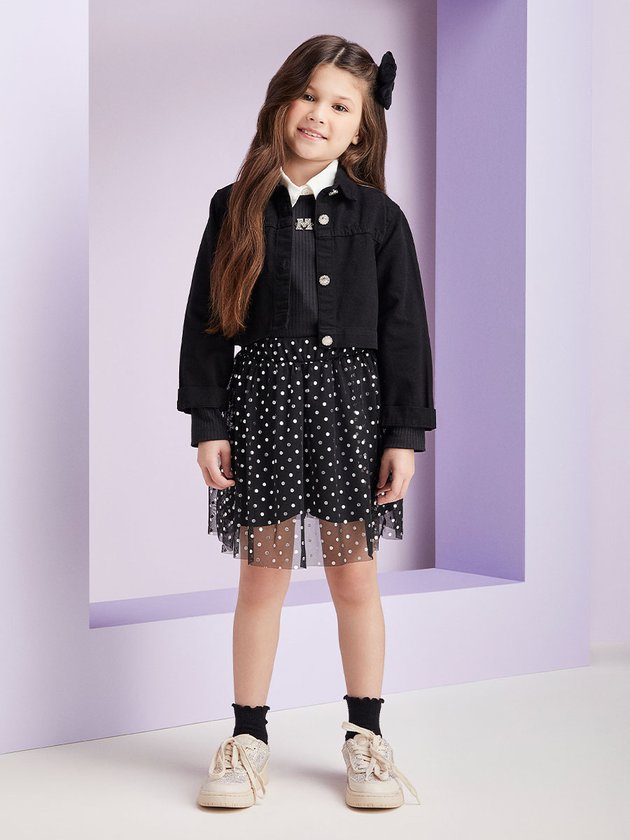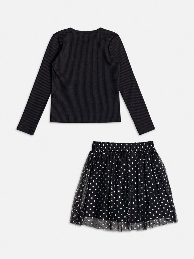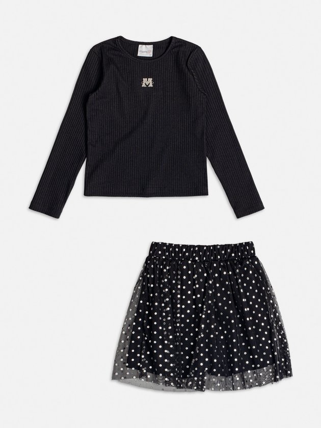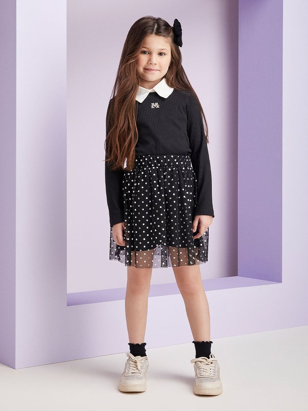 Dê um toque de charme aos momentos especiais com o conjunto de poá em preto e branco. A blusa traz um visual canelado e aplicação de patch cravejado com strass. A saia com tule estampado e forro em meia malha, proporciona leveza e conforto. Composição: Blusa: 49% poliéster, 47% algodão e 4% elastano. Saia: 100% poliéster. Ref.: H5329