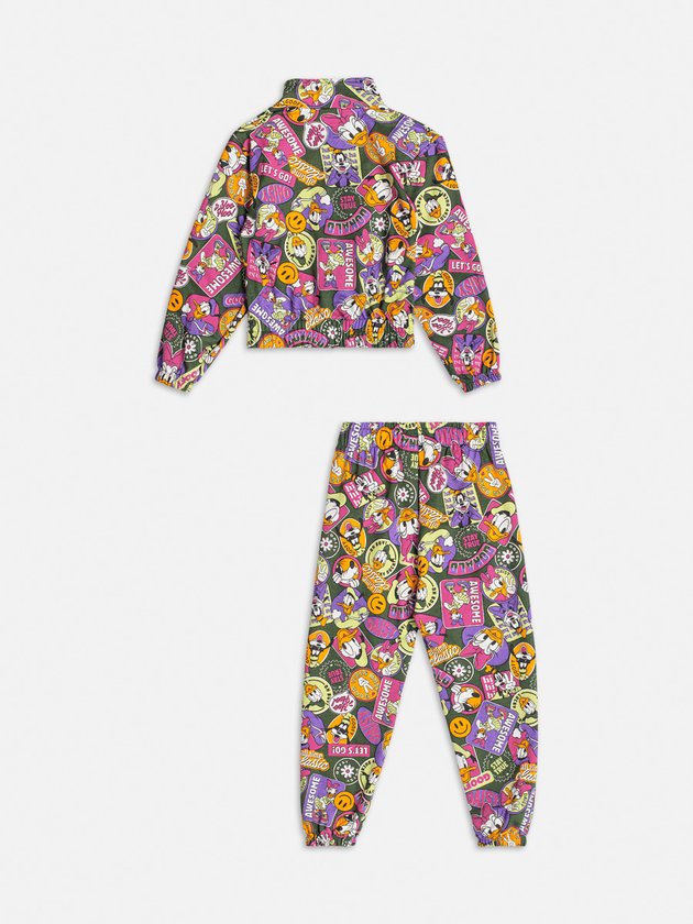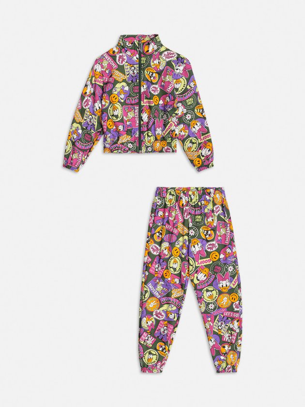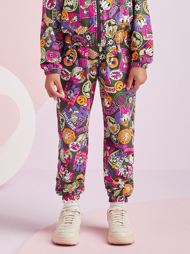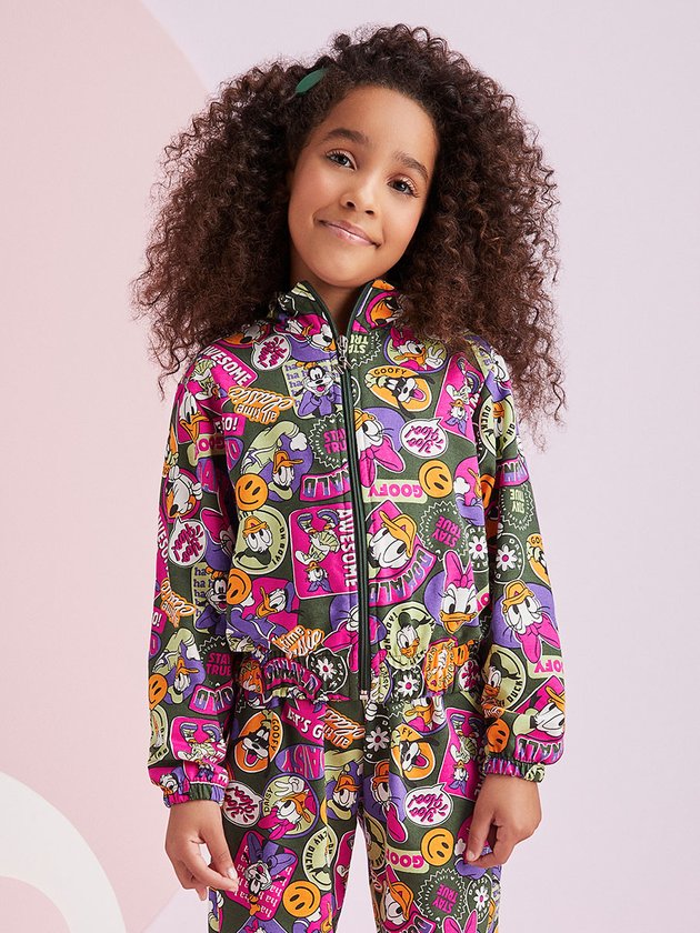 Puro charme e fashionismo! O conjunto traz casaco com manga longa Momi confeccionado no conforto do moletom com elástico no punho e fechamento através de zíper. A calça conta com elástico no cós e barra. O conjunto possui estampa de bottons dos personagens mais amados da Disney, Daisy, Pateta e o Pato Donald. Composição: 100% algodão. Ref.: H5258
