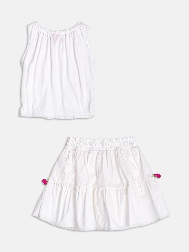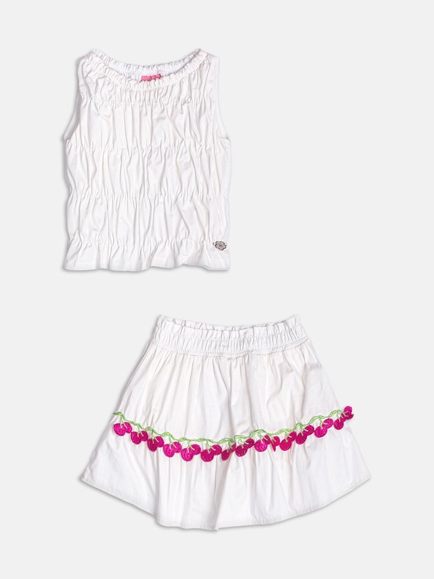 Esse conjunto off white encanta com estampa delicada de cerejinhas e detalhes em lastex que conferem caimento ajustado e visual romântico. A blusa tem acabamento franzido, valorizando a delicadeza da peça. A saia acompanha com elástico confortável e bordado de cerejas. Uma proposta leve e fresca para os dias de verão. Ideal para compor looks doces e femininos. Ref.: J7164