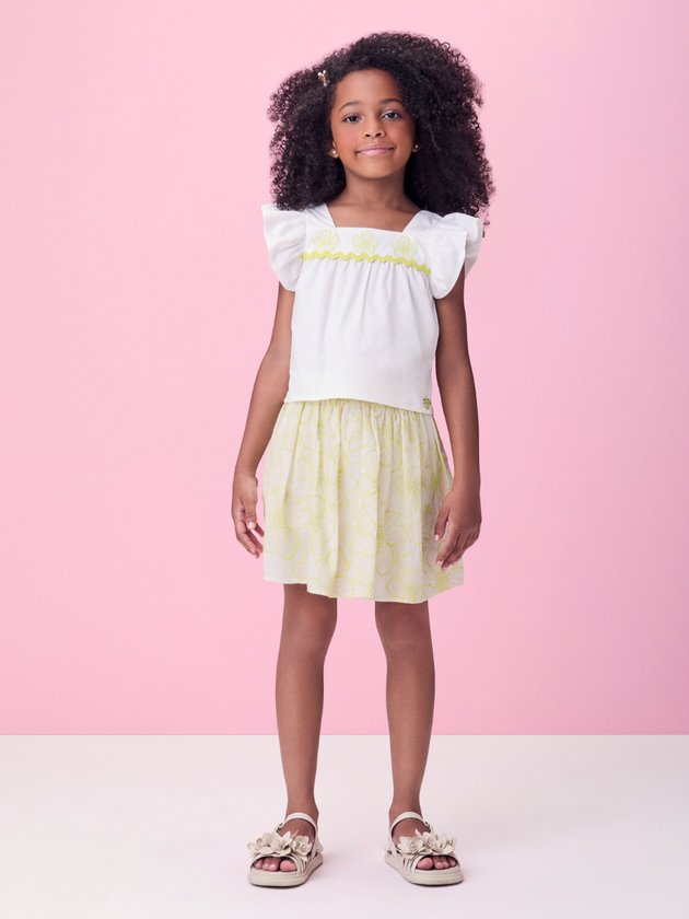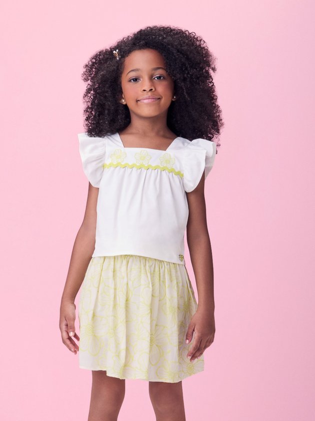 Blusa: 98% Algodão e 2% Elastano Saia: 100% Algodão