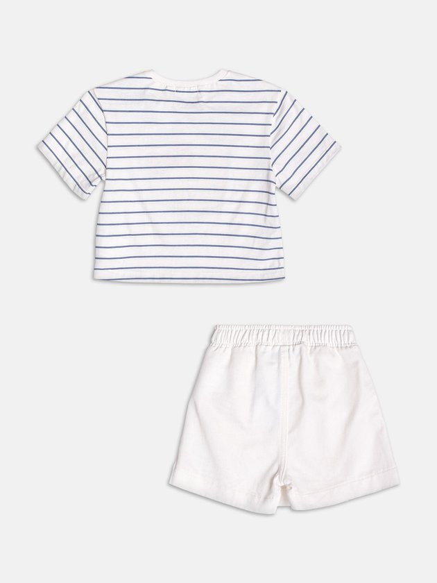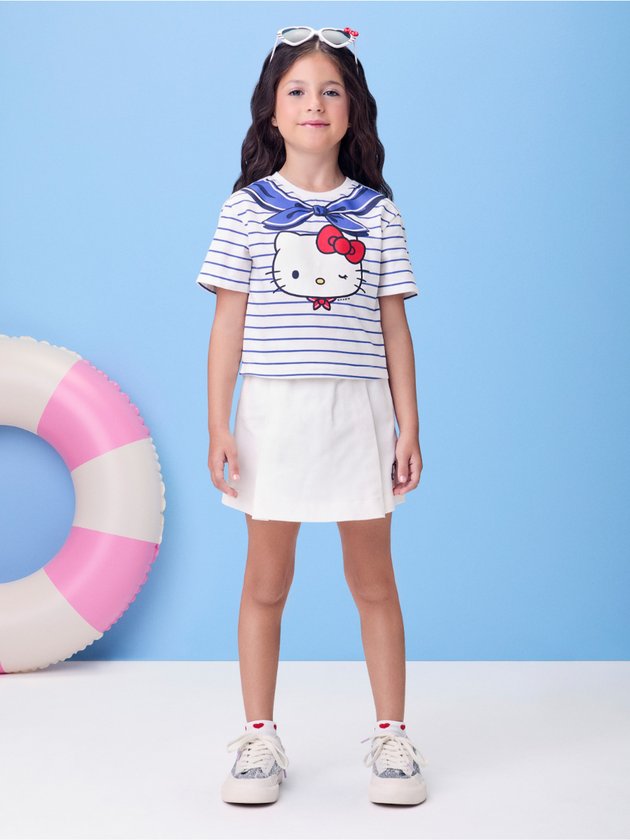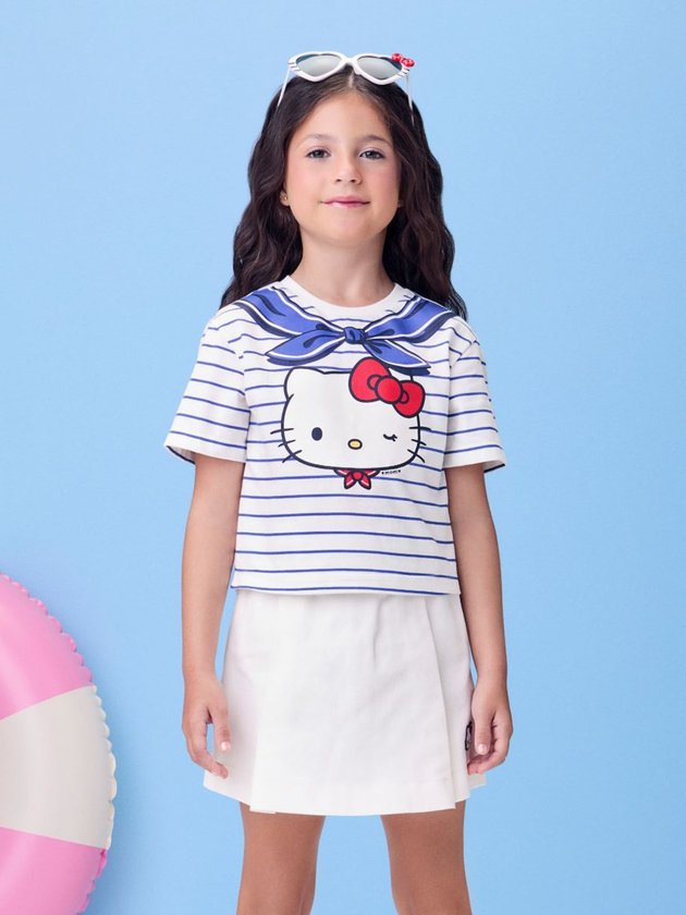 Romântico, moderno e superversátil, esse conjunto off white com listras suaves traz a Hello Kitty em uma versão delicada e charmosa. A blusa tem toque leve e caimento soltinho, ideal para os dias mais quentes. O short coordenado completa o visual com praticidade e conforto. A paleta neutra permite diversas combinações com acessórios coloridos. Um look leve e encantador para curtir o verão com estilo.