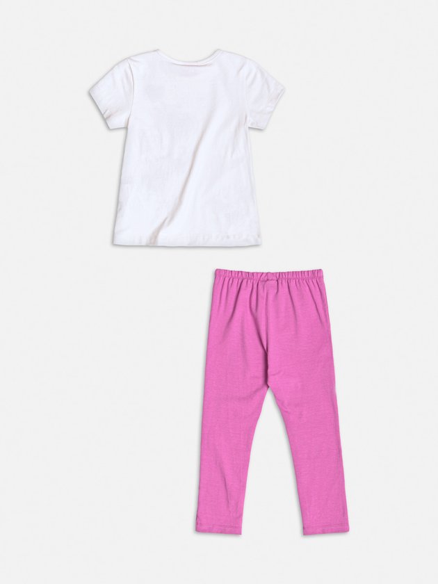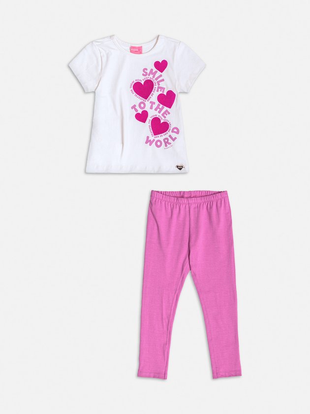 Com mensagem positiva e estampa flocada apaixonante, esse conjunto une uma blusa off de manga curta com legging rosa, garantindo conforto com um toque de amor. Um look para meninas que encantam por onde passam!