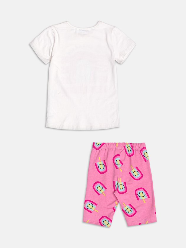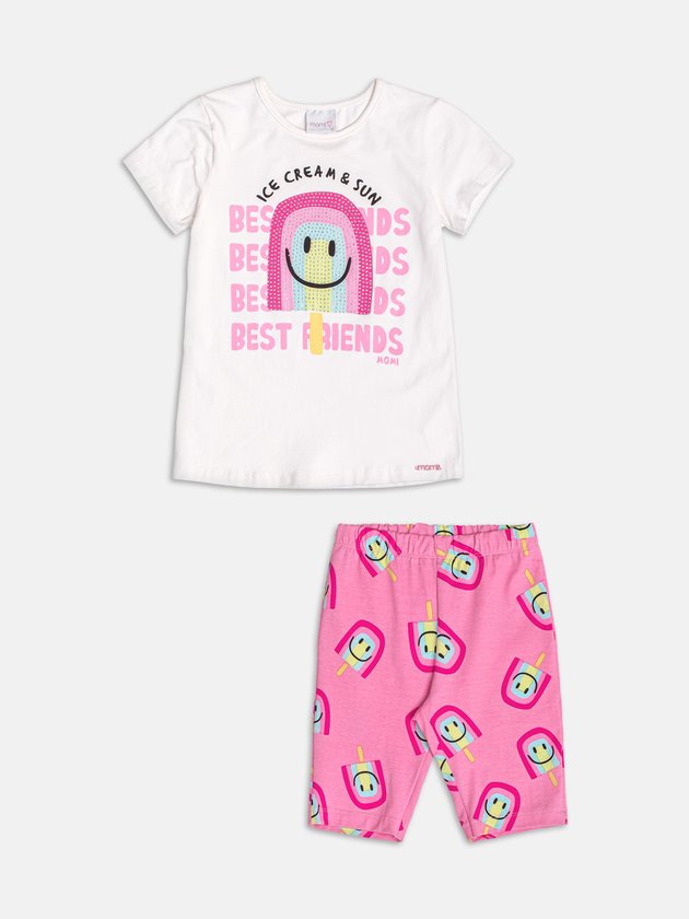Delicioso como um sorvete em dia quente, esse conjunto off white é puro charme! A blusa traz estampa divertida de ice creams coloridos e lettering fofo, com toque suave ao vestir. O short acompanha a proposta com um ar despojado e delicado ao mesmo tempo. A cartela de cores suaves traz leveza à produção, criando um visual lúdico e encantador. Ideal para os dias mais doces do verão. Ref.: H6551