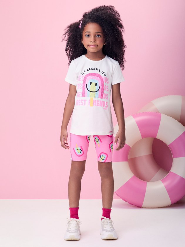 Delicioso como um sorvete em dia quente, esse conjunto off white é puro charme! A blusa traz estampa divertida de ice creams coloridos e lettering fofo, com toque suave ao vestir. O short acompanha a proposta com um ar despojado e delicado ao mesmo tempo. A cartela de cores suaves traz leveza à produção, criando um visual lúdico e encantador. Ideal para os dias mais doces do verão.