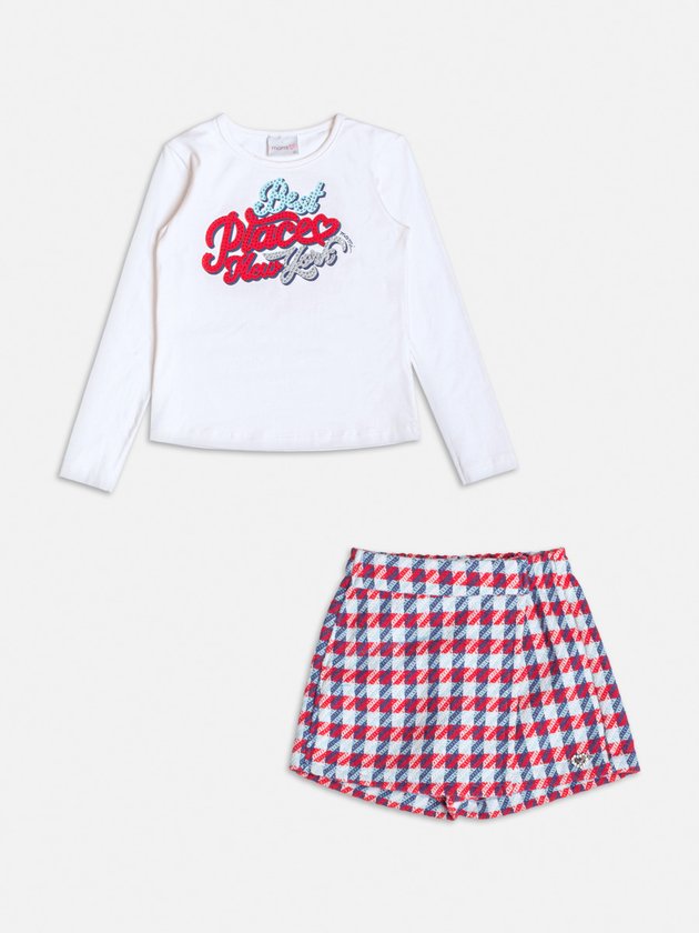 O conjunto "Best Places New York" é um charme só! Composto por uma blusa branca com manga longa, que traz estampa com aplicação de brilho, e shorts xadrez vermelho e azul para um toque clássico e moderno. Ideal para dias de passeio com muito estilo. Ref.: H6140