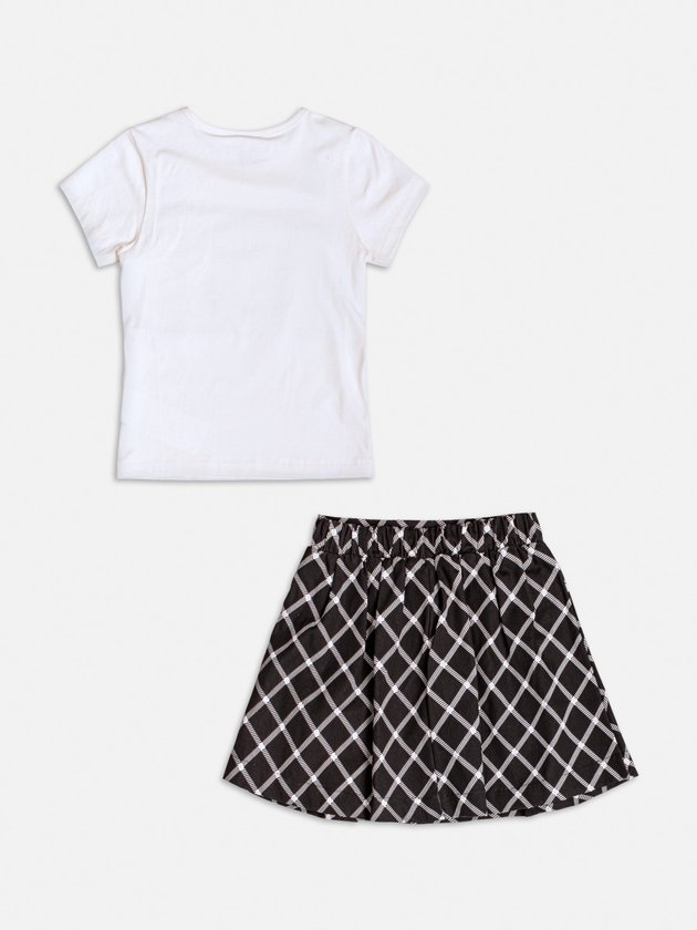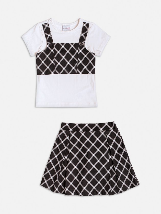 Um conjunto moderno e estiloso que traz sofisticação e diversão ao mesmo tempo. A blusa manga curta off-white em tecido confortável combina perfeitamente com o cropped preto sobreposto, criando um contraste contemporâneo e cheio de personalidade. A saia em estampa geométrica dá o toque final ao look, proporcionando movimento e charme em cada detalhe. Ideal para ocasiões casuais ou momentos especiais em que estilo e conforto são indispensáveis. Um conjunto perfeito para expressar autenticidade e criatividade! Ref.: H6201