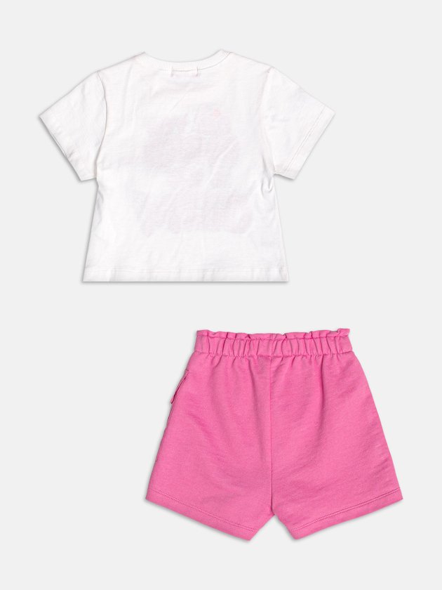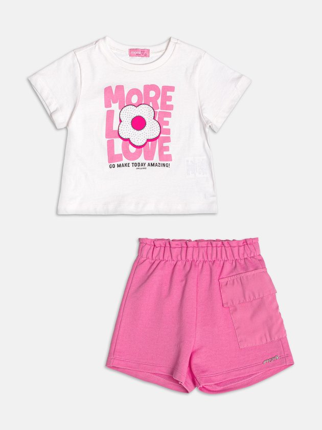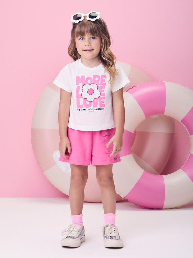 Esse conjunto rosa coral traz o brilho do verão em forma de flor. A blusa tem aplicação de flor com strass no centro, criando um ponto de luz delicado e sofisticado. O short acompanha com conforto e modelagem prática, perfeito para brincar com liberdade. A cor intensa conversa com o mood vibrante da temporada. Um look moderno, charmoso e com o toque de brilho que as meninas amam.