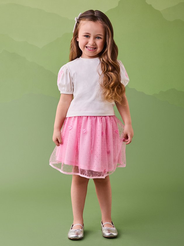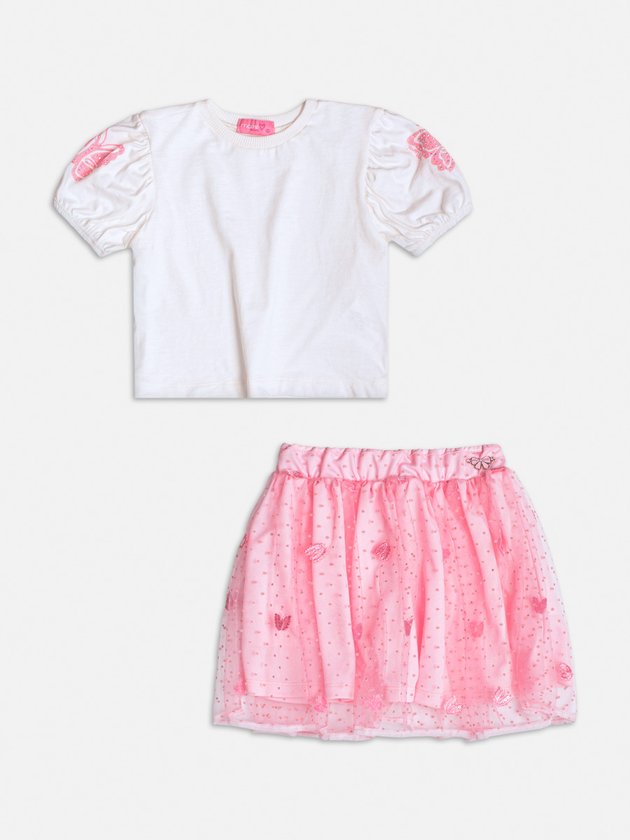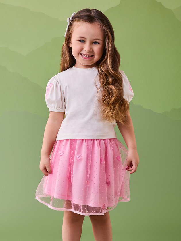 Romântico e cheio de encanto, esse conjunto traz blusa com mangas bufantes e saia de tule com aplicação de borboletas flocadas. Uma proposta delicada que convida a sonhar e se sentir uma verdadeira fadinha do inverno.