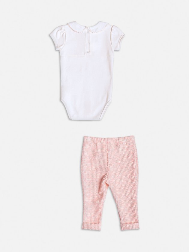 Elegância em cada detalhe! Este conjunto apresenta um body branco com gola bordada de corações e uma calça rosa texturizada que combina sofisticação e conforto. Ideal para compor looks delicados e repletos de charme.