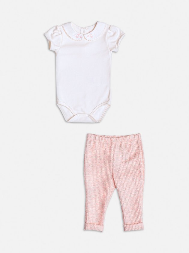 Este elegância em cada detalhe! Este conjunto apresenta um body branco com gola bordada de corações e uma calça rosa texturizada que combina sofisticação e conforto. Ideal para compor looks delicados e repletos de charme. Ref.: C2475