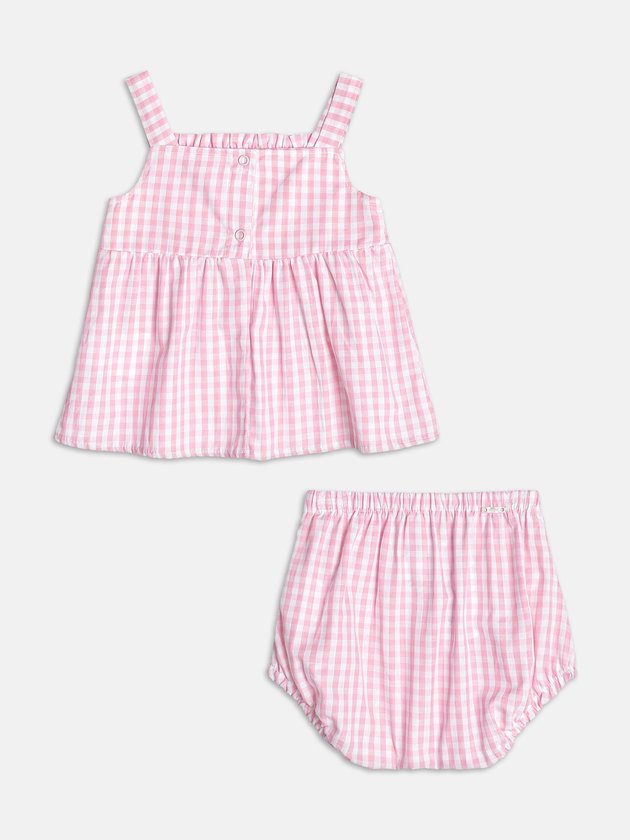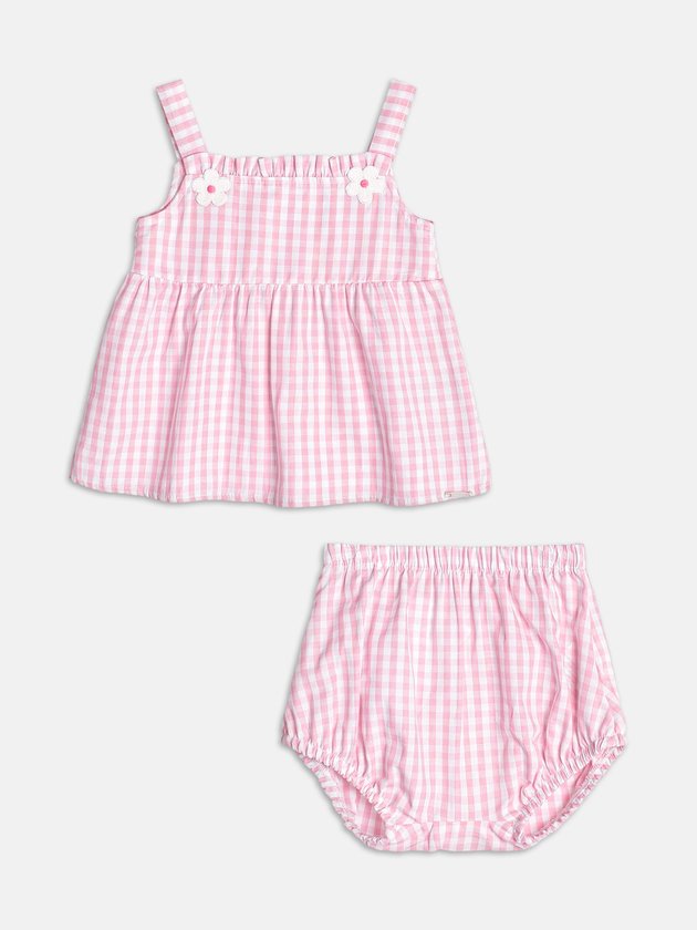 Um conjunto que transborda charme e delicadeza! A blusa traz estampa xadrez vichy em tom rosa, com patch de flor bordada no peitoral, além de detalhe de gola boneca e botões decorativos. O short coordenado complementa o look com cós elástico e acabamento impecável, proporcionando conforto e aquele toque romântico que é a cara da Momi. Ref.: C2662