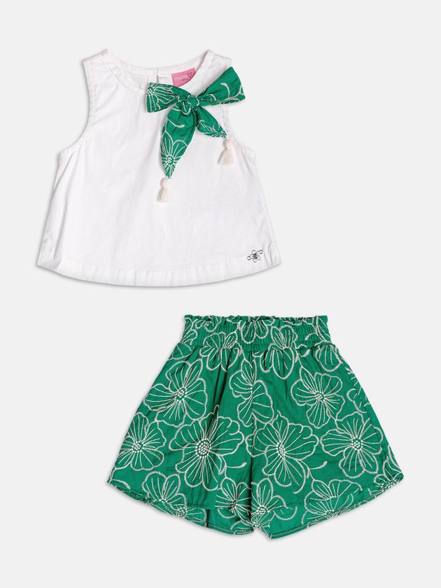 O romantismo da laise aparece em destaque nesse conjunto encantador em tom de verde suave. A blusa é adornada com um maxi laço central que adiciona charme e elegância à peça. O short coordenado completa o look com leveza e conforto, mantendo o equilíbrio entre o clássico e o moderno. Ideal para ocasiões especiais ou para dar um toque refinado aos dias comuns. Um visual que traduz o espírito sofisticado e lúdico da coleção. Ref.: J6885