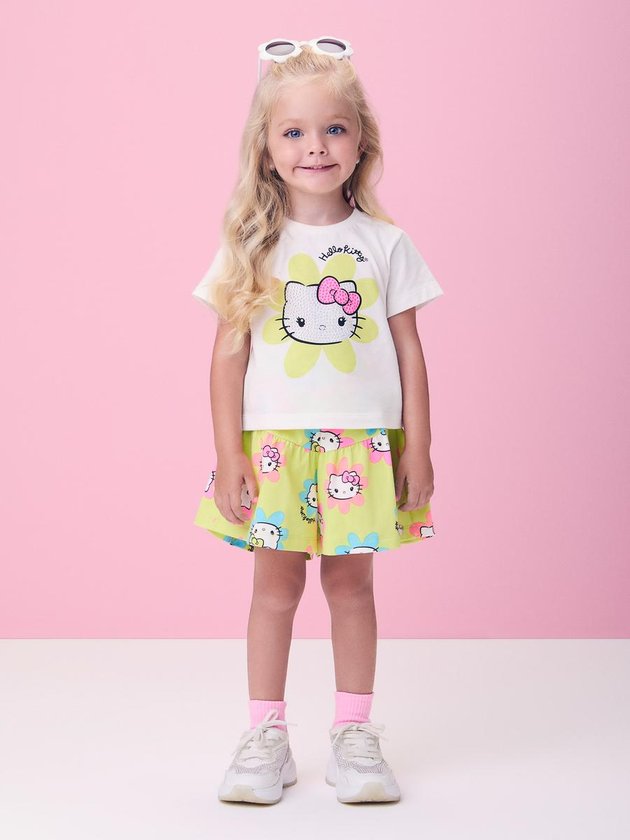 Um dos destaques da coleção, o conjunto verde melon traz Hello Kitty em meio a flores vibrantes que lembram margaridas. O contraste entre o fundo cítrico e os elementos neon cria uma estética super moderna. O strass aplicado na estampa da blusa e shortinho confortável completa o look com graça e atitude.