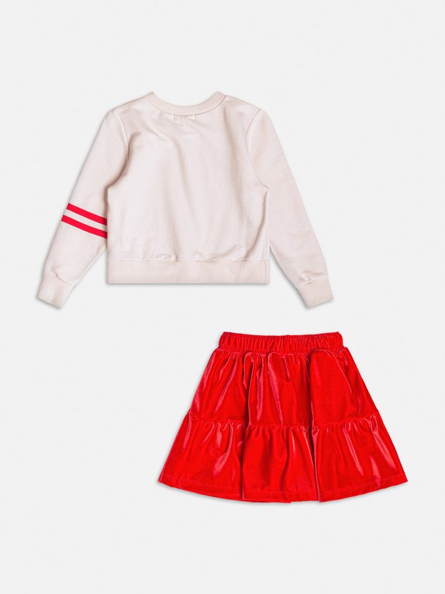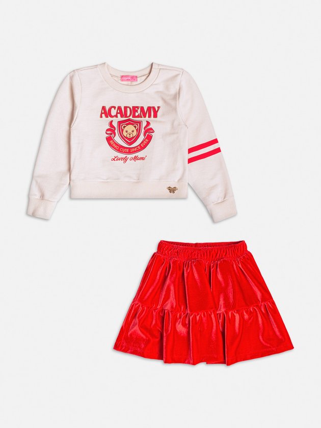 Este combine delicadeza e sofisticação com este conjunto encantador. O moletom traz um toque esportivo com detalhes bordados e a saia em tecido vermelho com brilho adiciona feminilidade à produção. Perfeito para ocasiões especiais, é um look que une conforto e estilo para momentos inesquecíveis. Ref.: J6801