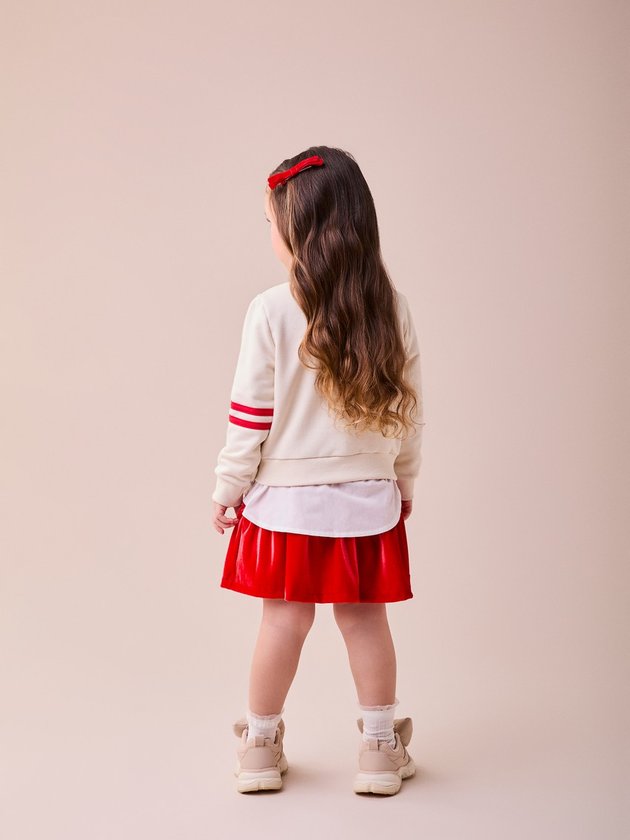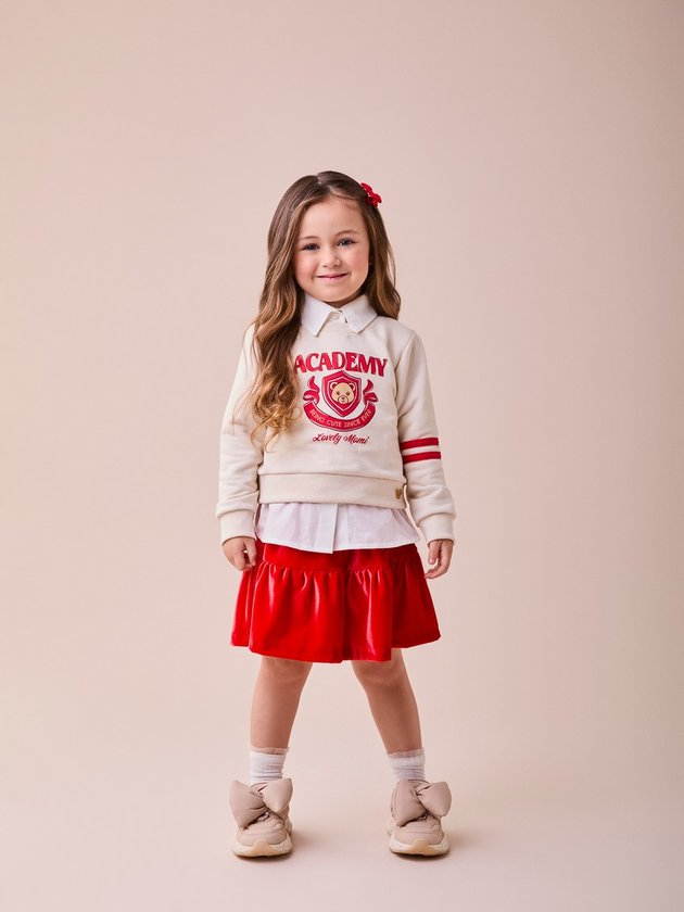 Combine delicadeza e sofisticação com este conjunto encantador. O moletom traz um toque esportivo com detalhes bordados e a saia em tecido vermelho com brilho adiciona feminilidade à produção. Perfeito para ocasiões especiais, é um look que une conforto e estilo para momentos inesquecíveis.