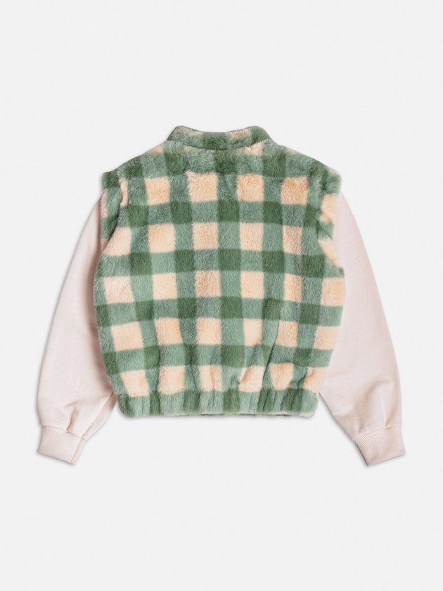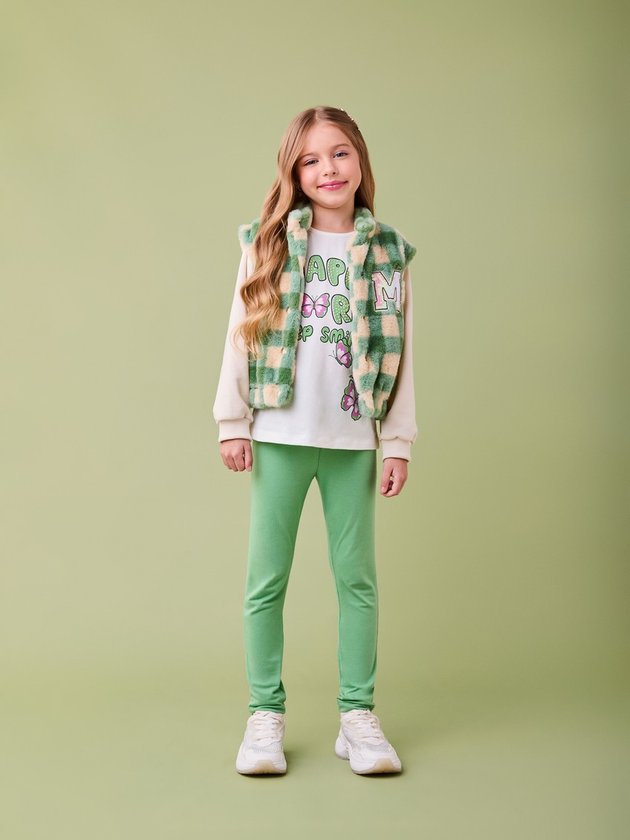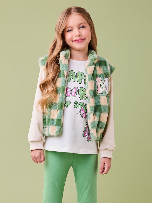 Aconchego, estilo e personalidade em uma só peça! A jaqueta de pelo com estampa xadrez verde e bege traz um visual super moderno com toque macio e quentinho. O destaque fica por conta da aplicação com paetês da letra M, que adiciona brilho e um ar divertido à composição. Com mangas em moletom e punhos ajustados, é perfeita para os dias frios com muito charme.