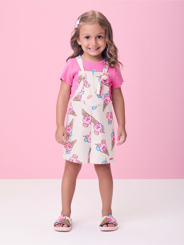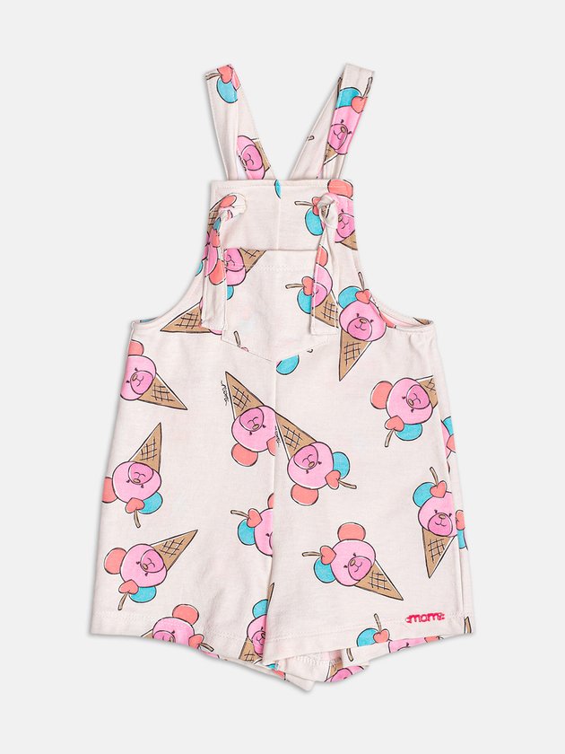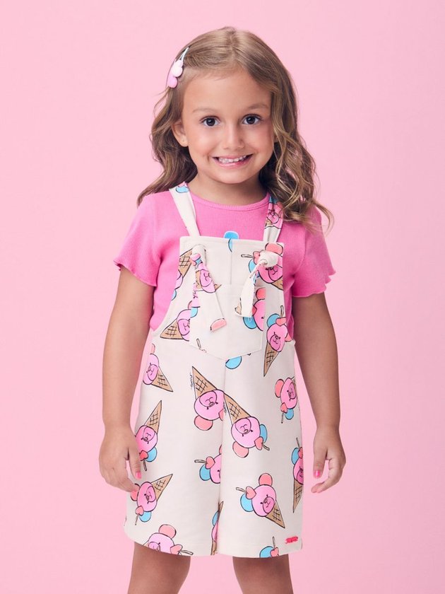 Inspirada nas delícias do verão, essa jardineira bege traz estampa de sorvetes em formato de ursinhos que encantam logo de cara. O visual lúdico é equilibrado pelo tom neutro, criando uma peça versátil e divertida. Ideal para combinar com blusas coloridas da coleção. Um look gostoso de vestir, perfeito para dias de sol e diversão.