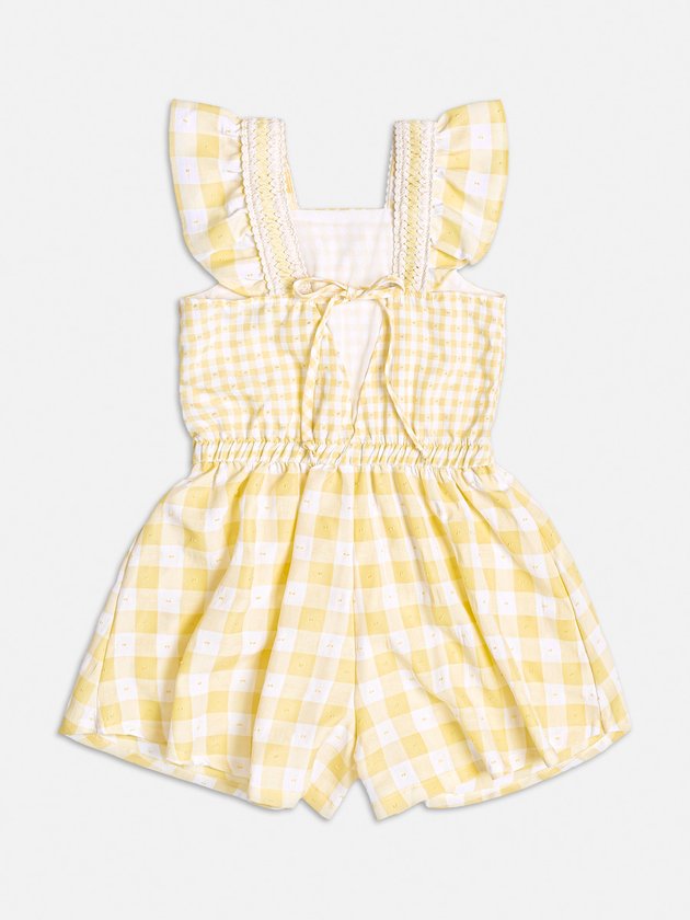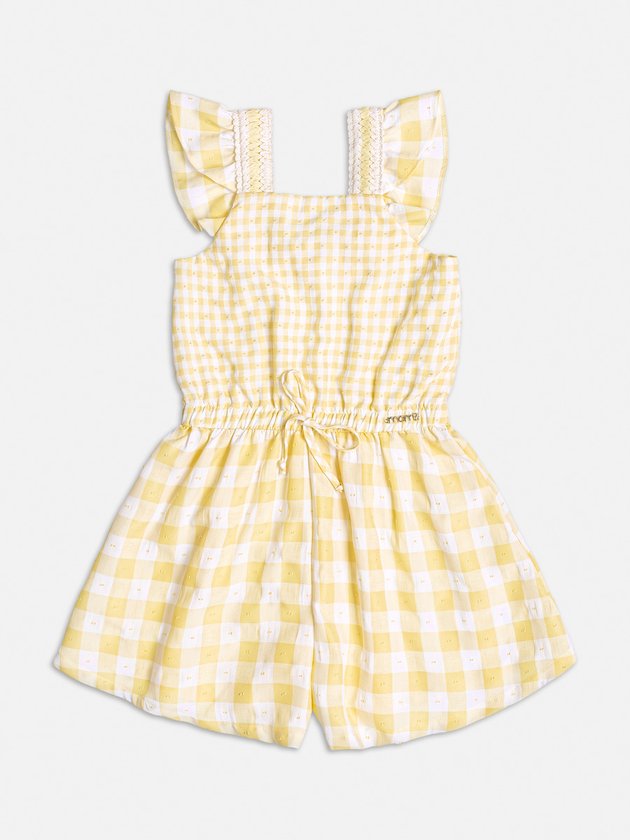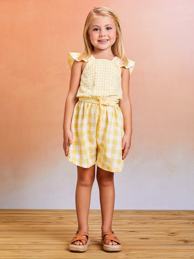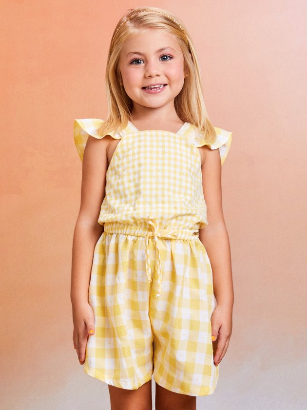 Um toque encantador para o verão: Macaquinho infantil amarelo e branco com estampa vichy. As alças com babados adicionam um charme especial. Perfeito para dias ensolarados e aventuras alegres. Composição: 52% viscose e 48% poliéster. Ref.: H4575