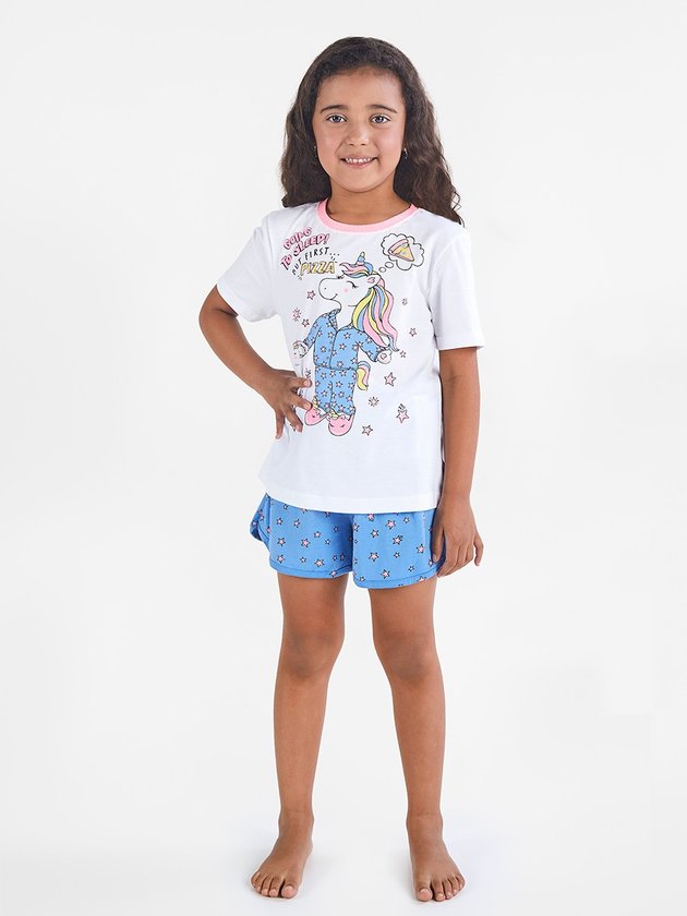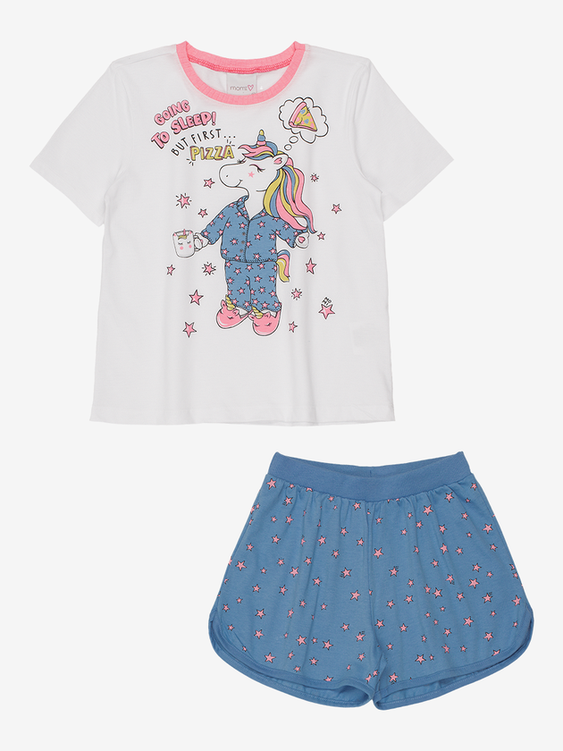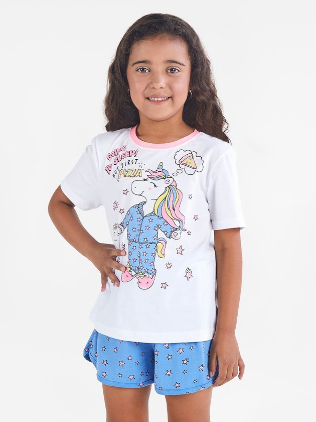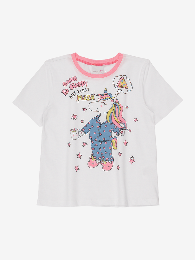 Deixe as noites da sua pequena ainda mais encantadoras com este adorável conjunto de pijama da Momi! O kit inclui uma camiseta branca com estampa de unicórnio, que traz a mensagem "Going to Dream My Next Pizza" para adicionar um toque divertido ao visual. O unicórnio, com sua crina colorida e pijama estampado, deixa a peça ainda mais fofa, além de ser superconfortável para a hora de dormir. Ref.: H2895
