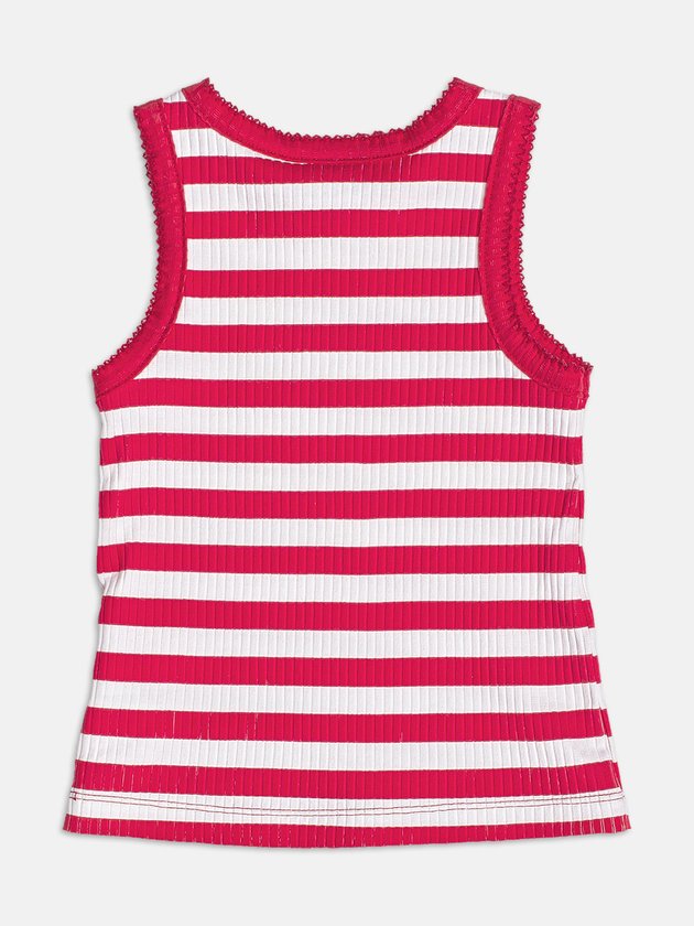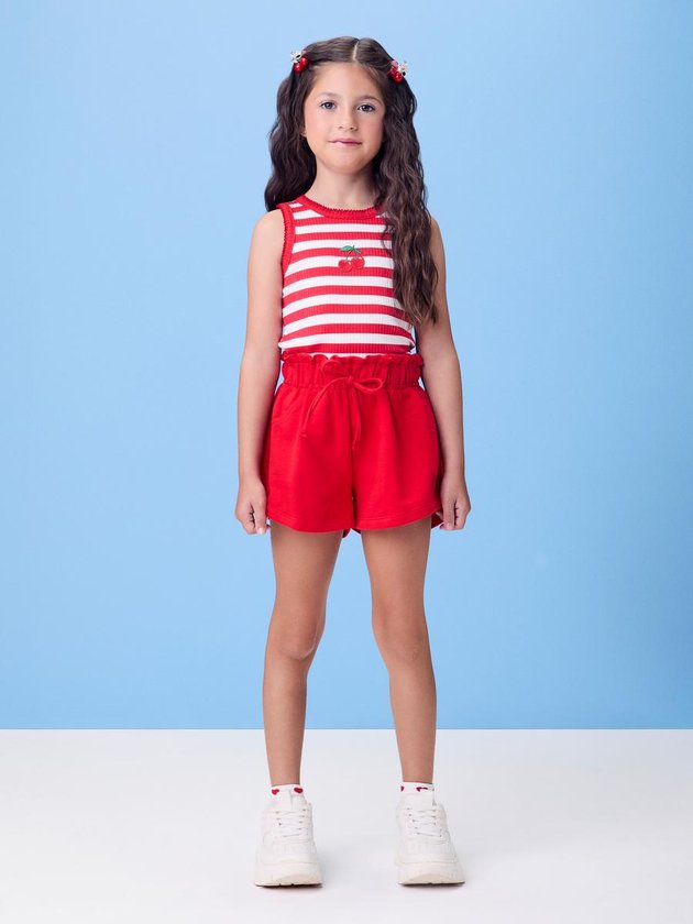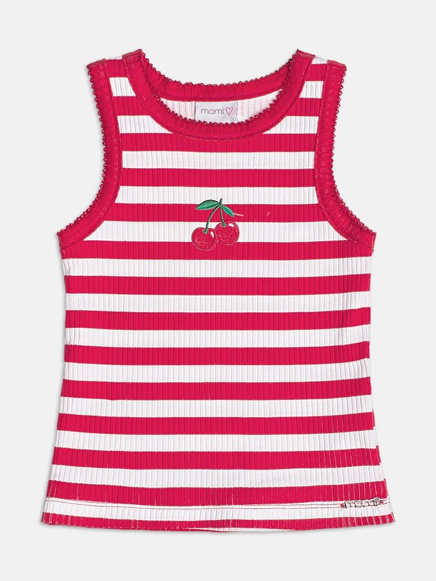 Essa regata aposta na estética navy com um toque frutado encantador. As listras finas em tons suaves criam uma base clássica, enquanto o patch bordado de cereja adiciona um ponto de cor divertido e delicado. O caimento leve e o decote confortável garantem frescor nos dias mais quentes. Combina perfeitamente com shorts e saias coloridas da coleção. Um look descomplicado com charme na medida certa.