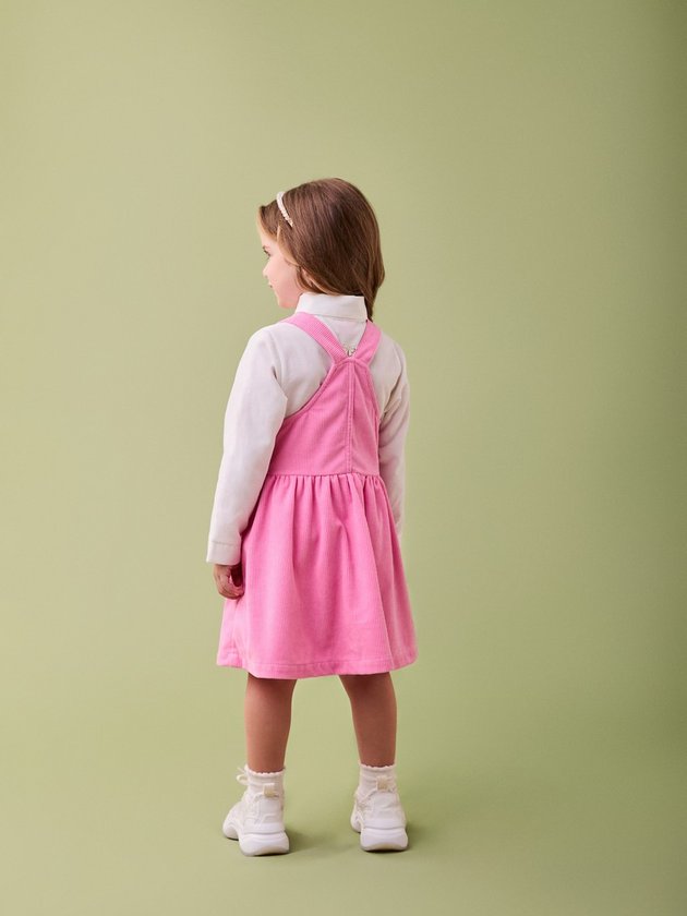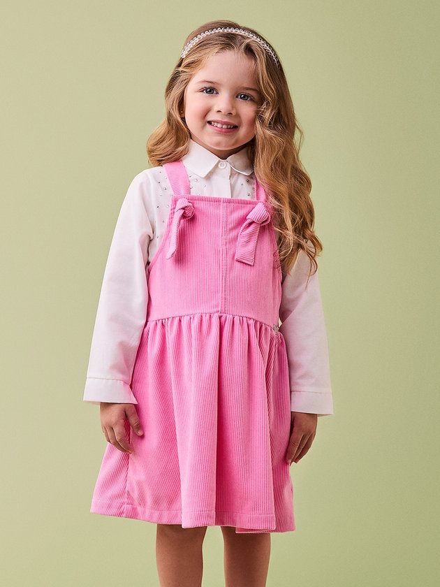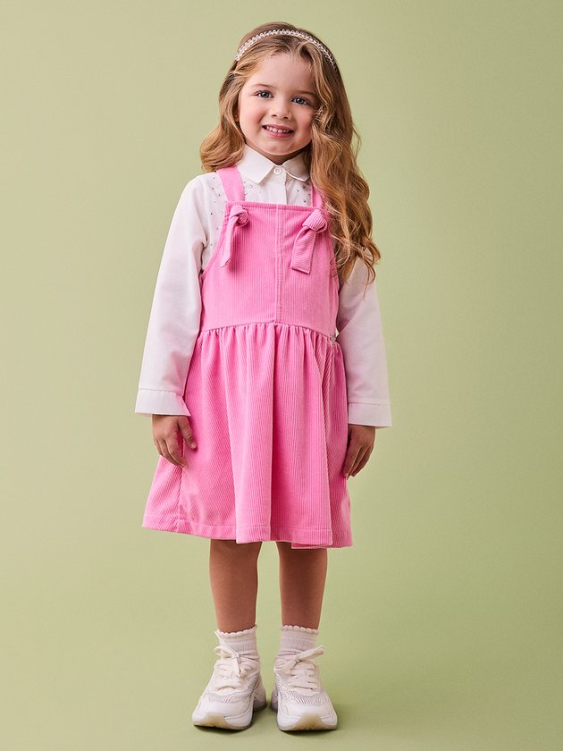 Com visual acolhedor e toque macio, a salopete rosa em veludo cotelê traduz o lado mais delicado e encantador do inverno. Os laços aplicados no busto trazem o charme Momi em evidência, enquanto o tom candy aquece a paleta da temporada com doçura e elegância. Um pingente brilhante adiciona o toque final perfeito para as pequenas que amam brilhar com sutileza.