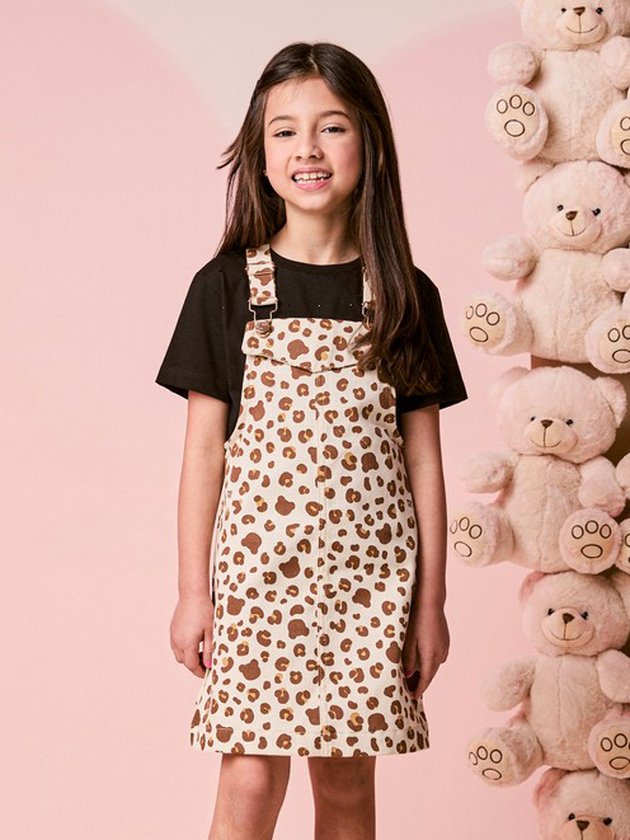 A Salopete Infantil de Sarja Bear Print é perfeita para quem ama um visual fofo e fashion ao mesmo tempo. Feita em sarja leve e confortável, ela apresenta estampa exclusiva de ursinhos misturada ao animal print, criando um efeito moderno e divertido. As alças com ajuste e botões dourados deixam o look ainda mais charmoso e funcional. Ideal para compor combinações com blusas, tricôs ou camisetas, é uma peça versátil que transita facilmente entre o dia a dia e momentos especiais. Um item indispensável para um guarda-roupa infantil cheio de estilo e conforto!