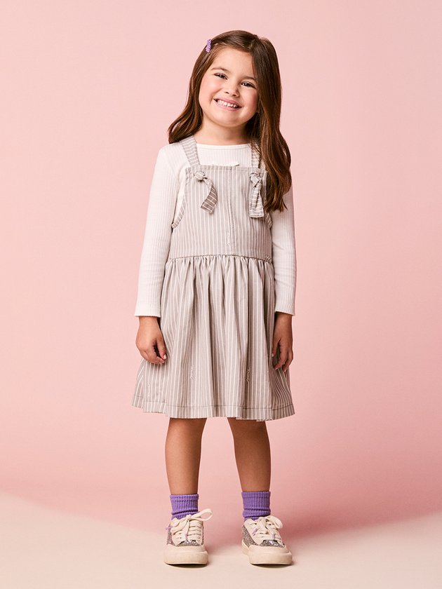 A Salopete Infantil de Sarja Listrada combina o charme clássico das listras com a delicadeza que define o universo Momi. Confeccionada em sarja macia, ela possui alças confortáveis e duas amarrações aplicados no busto, que deixam o visual ainda mais doce e feminino. A saia rodada cria movimento leve e encantador, perfeita para acompanhar as pequenas em qualquer momento do dia. O padrão de listras finas traz um toque elegante e moderno, tornando a peça versátil para compor desde looks descontraídos até produções mais arrumadinhas. Confortável, estilosa e cheia de personalidade, essa salopete é aposta certeira para o inverno das meninas.
