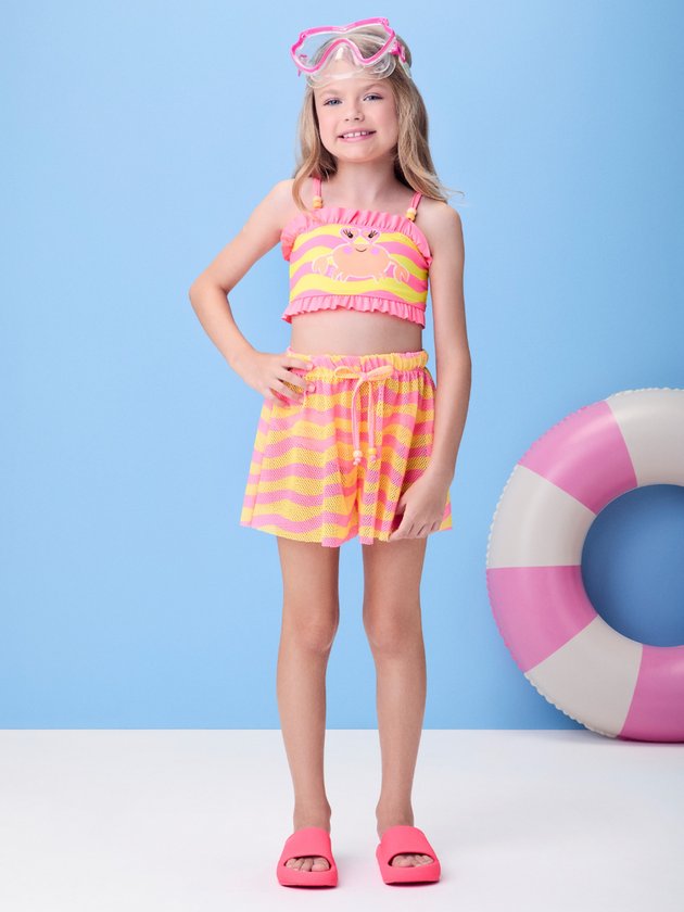 Com mood praiano e toque leve, esse short é perfeito para acompanhar os dias de sol e mergulho. A estampa de ondinhas em tons suaves reforça o espírito do verão, enquanto o cós elástico garante conforto e praticidade. Pode ser usado por cima do biquíni ou combinado com blusinhas leves da coleção. Um visual descomplicado e cheio de frescor.