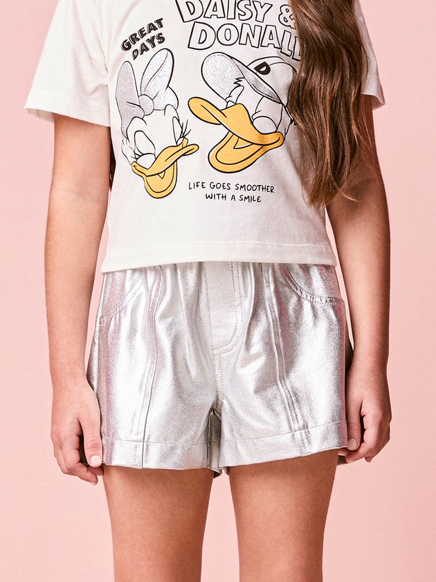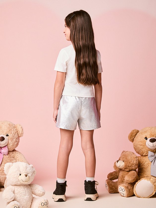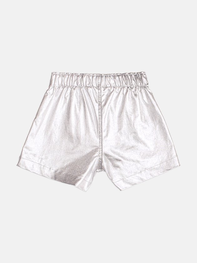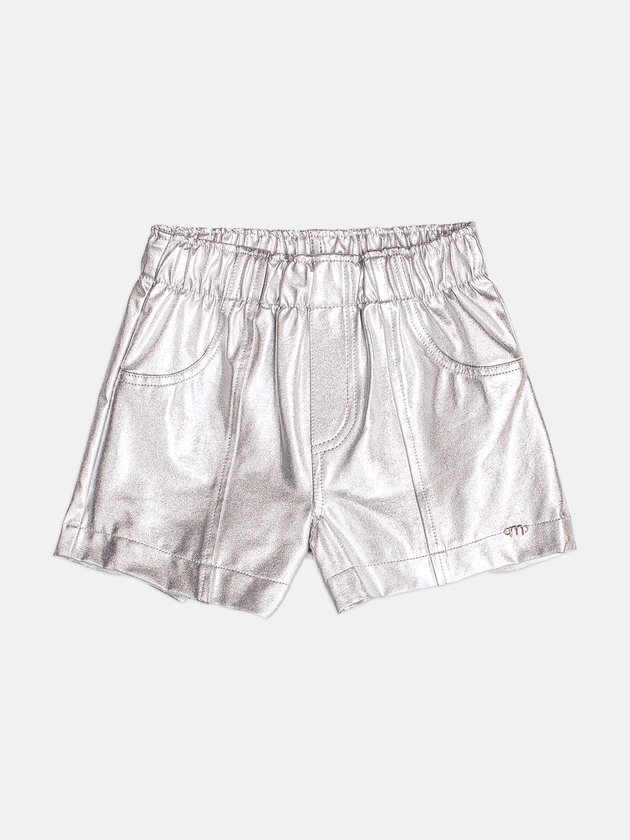 O Shorts Menina Momi Infantil Metalizado é confeccionado em material com acabamento metalizado prata, trazendo brilho intenso e visual fashionista. Possui modelagem confortável, cós com elástico para melhor ajuste e bolso fake frontal que agrega charme ao design. Ideal para compor looks modernos e cheios de personalidade. Ref:. H6833