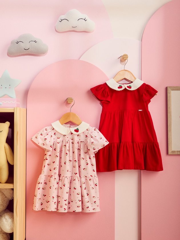 Puro charme e delicadeza! O vestido traz estampa de cerejinhas, gola boneca branca e detalhe de laço aplicado, além de saia rodada que garante movimento e um efeito super fofo. Uma peça que traduz romantismo e leveza em cada detalhe.