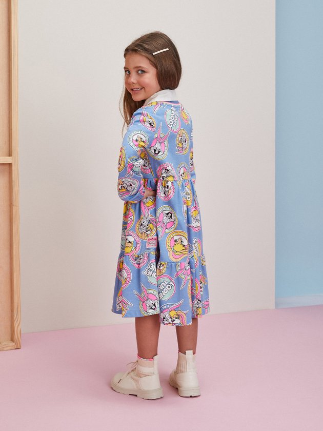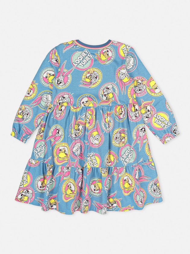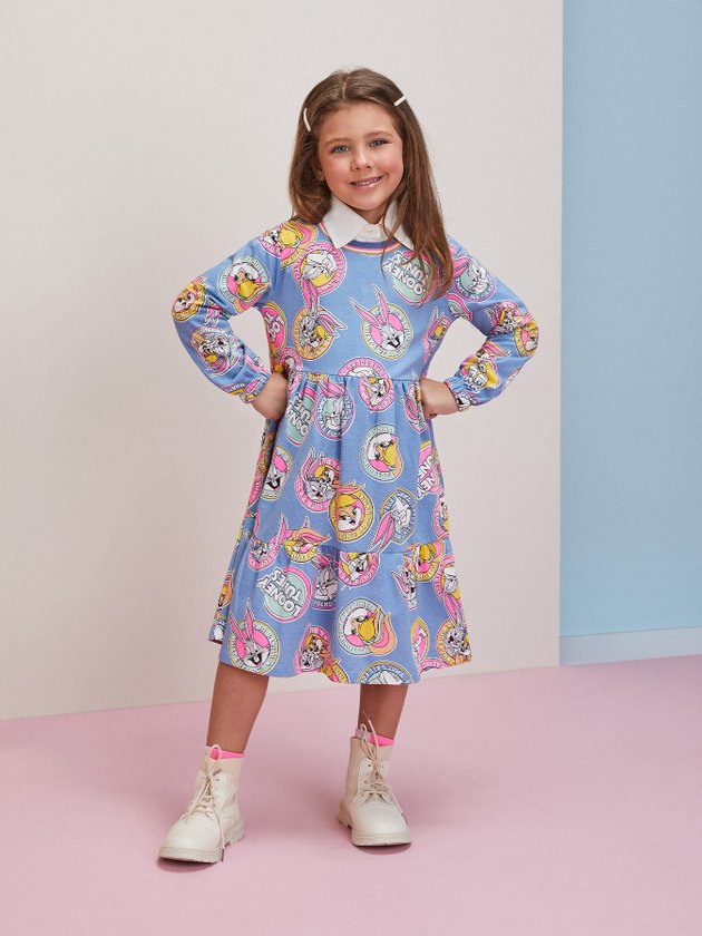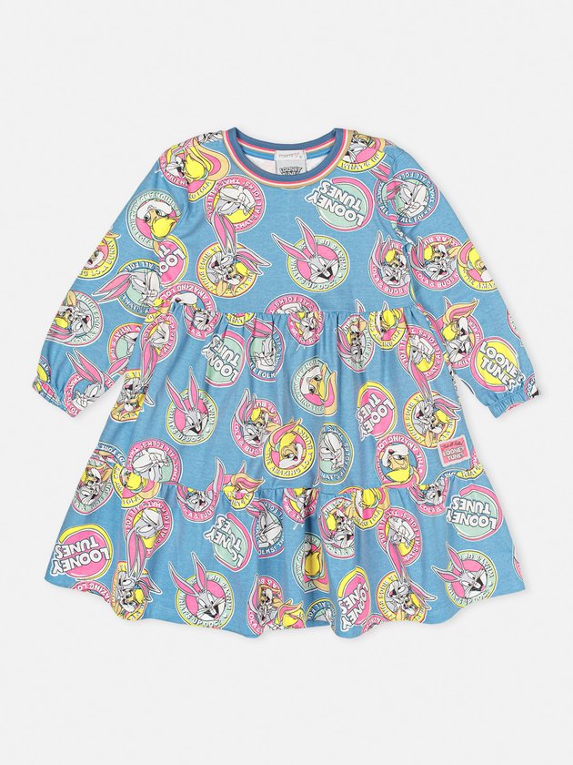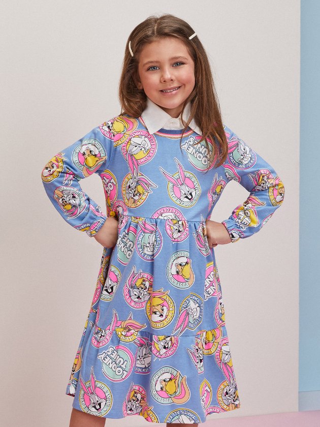 Confeccionado em moletom com estampa rotativa, o vestido de manga longa dos Looney Tunes é muito charmoso e vai acompanhar as meninas em looks estilosos do dia a dia. Finaliza seu design com etiqueta decorativa e gola personalizada. Composição: 100% algodão. Ref.: H4168