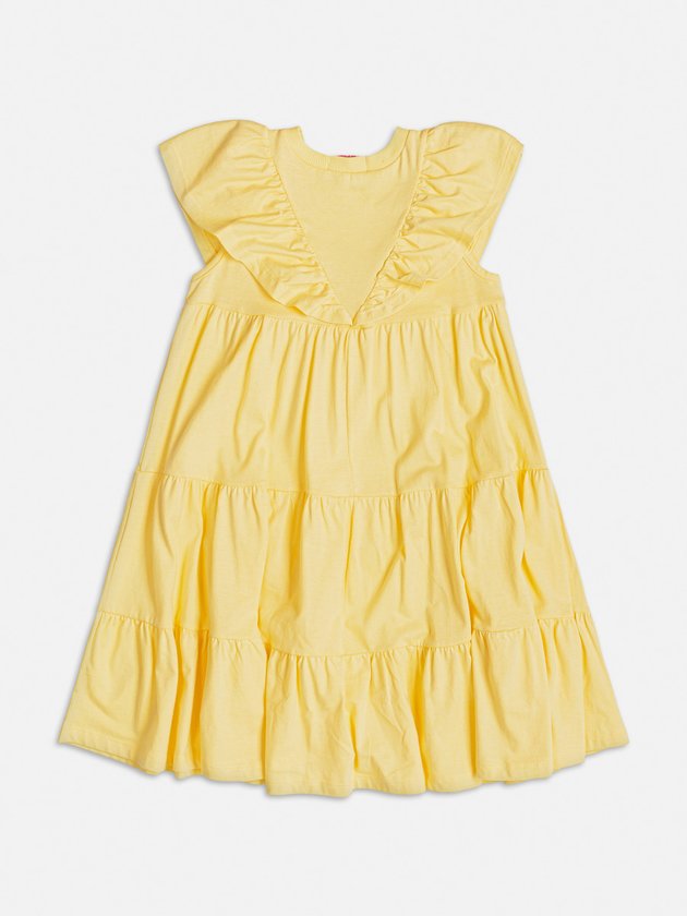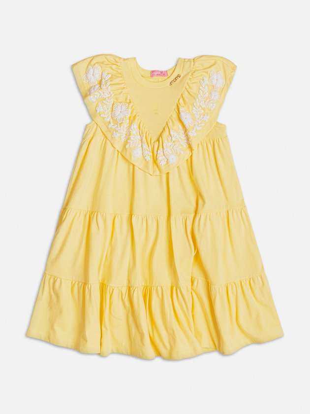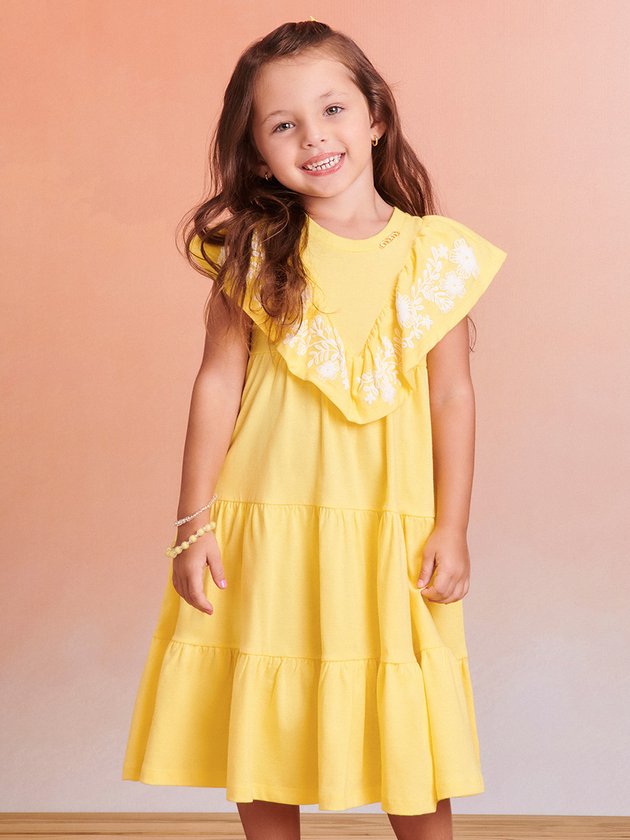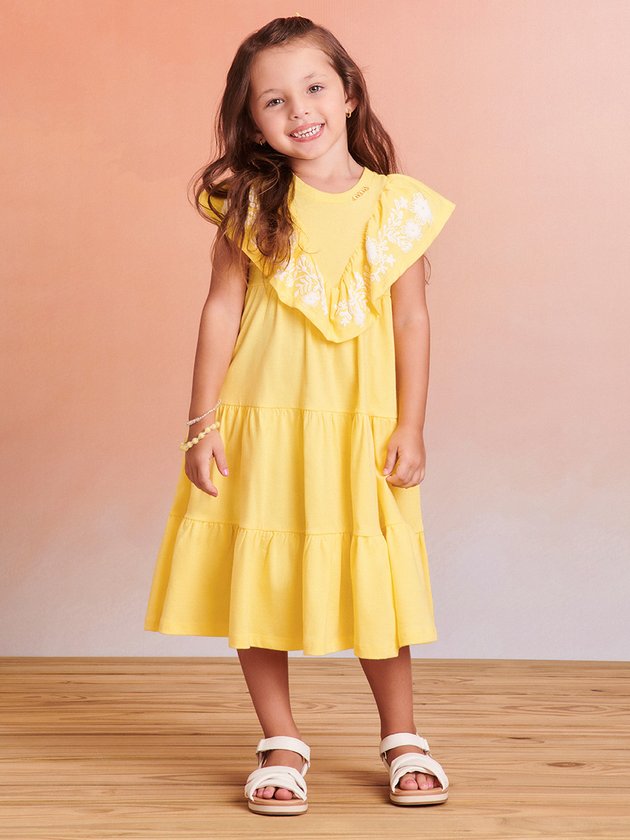 O Vestido amarelo Momi foi desenvolvido em meia malha com estampa puff. Saia com babados que conferem movimento especial. Um visual encantador para meninas que desejam estilo e charme em uma única peça. Detalhe adicional da plaquinha de metal. Composição: 100% algodão. Ref.: J5400