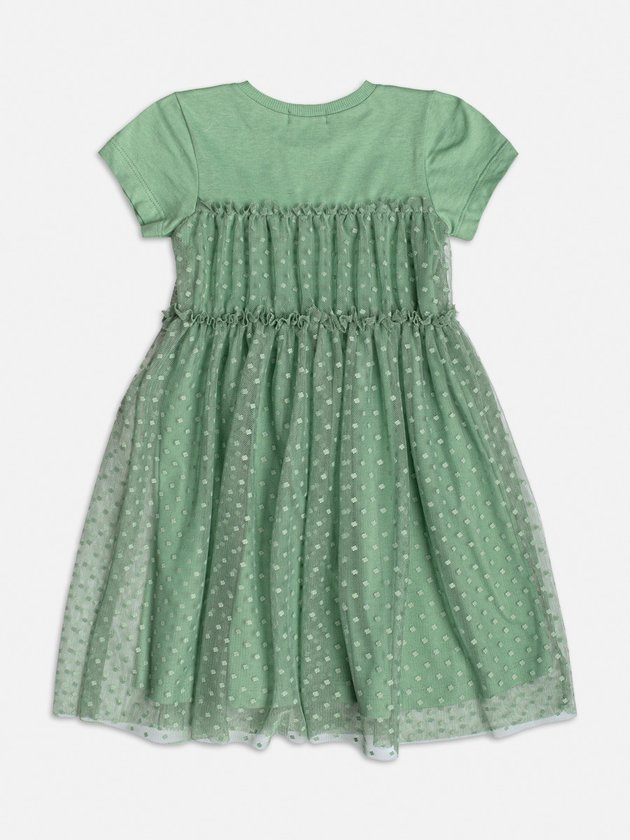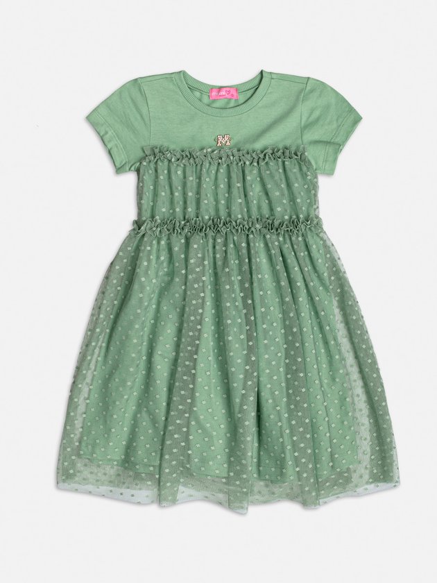 O romantismo está em alta com este vestido verde que mescla o toque esportivo da malha com a delicadeza do tule poá. Os babadinhos posicionados em camadas criam um visual girly e atual. Uma peça leve e encantadora para produções que combinam conforto e sofisticação.