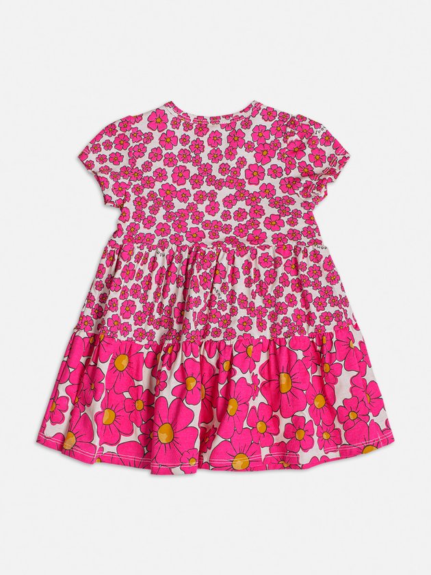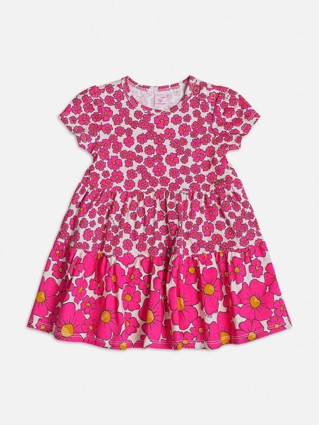 O vestido infantil Momi é uma adorável escolha para sua pequena. Confeccionado em meia malha, proporciona conforto durante todo o dia e sua estampa delicada de flores rosa acrescenta um toque encantador. Os babados na saia adicionam movimento e charme à peça. Com botão de pressão no ombro, vestir a criança é prático e fácil. Composição: 100% algodão. Ref.: C1890