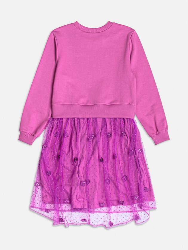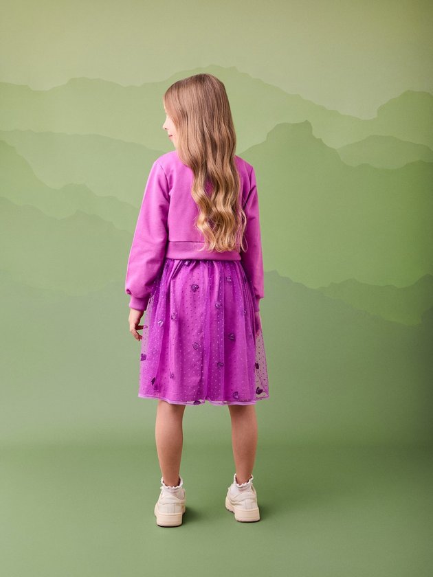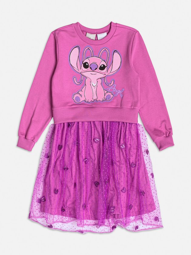 O vestido perfeito para as pequenas fãs da Angel! A parte superior em moletom traz estampa charmosa da personagem e acabamento canelado nas barras, enquanto a saia em tule bordado com borboletas e glitter adiciona um toque mágico ao visual. O tom roxo mystic e a mistura de texturas fazem dessa peça uma escolha fashionista e encantadora para os dias mais especiais.