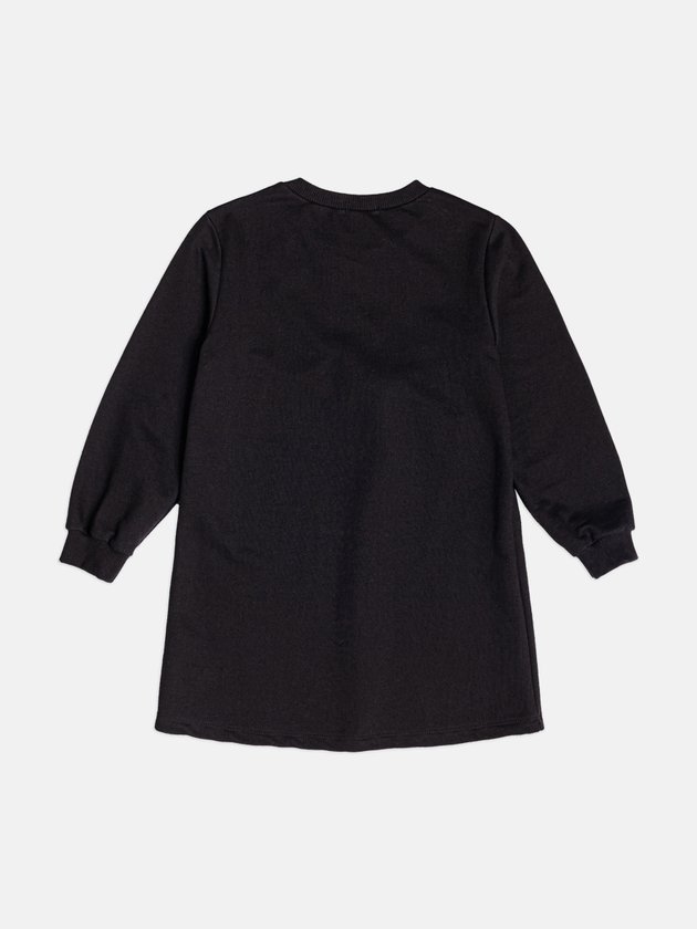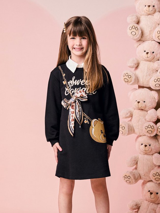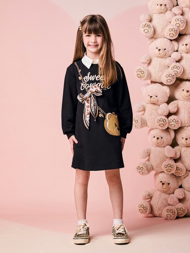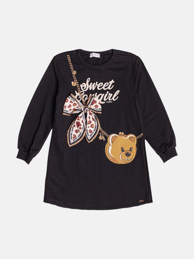 Esse vestido infantil de moletom com bolsa de ursinho é puro charme moderno. A peça une conforto e estilo com maestria: o moletom preto tem toque macio e veste superbem, enquanto a estampa criativa simula uma bolsinha de urso pendurada por uma corrente dourada. O laço estampado em animal print deixa o look ainda mais fashion e divertido, do jeitinho que as pequenas amam. Manga longa, modelagem soltinha e visual cheio de personalidade fazem desse vestido a escolha perfeita para passeios, festas ou aquele look casual estiloso. Um destaque da coleção que garante presença por onde passar. Ref.: H6971