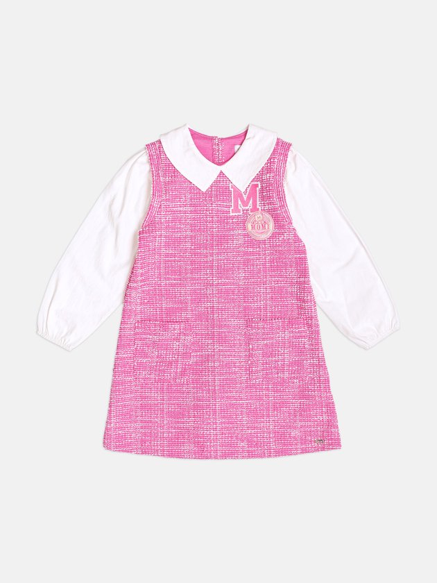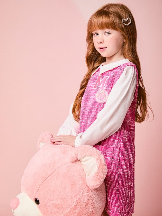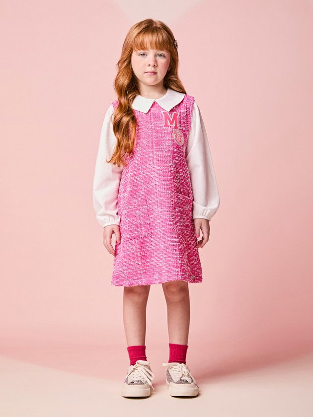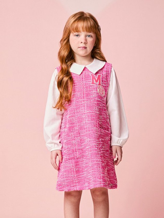 O vestido infantil de tweed com golinha é aquele look pronto que já entrega personalidade de longe. O tweed rosa vibrante rouba a cena com sua textura elegante, trazendo uma vibe moderna e cheia de atitude. A golinha branca adiciona um toque clássico super fofo, criando um contraste lindo que deixa a peça ainda mais especial. Os patches aplicados reforçam o estilo cool da marca, dando um ar divertido sem perder a delicadeza. Com mangas longas leves e modelagem confortável, o vestido é ideal para ocasiões especiais, fotos, passeios e qualquer momento que peça um visual marcante e estiloso.