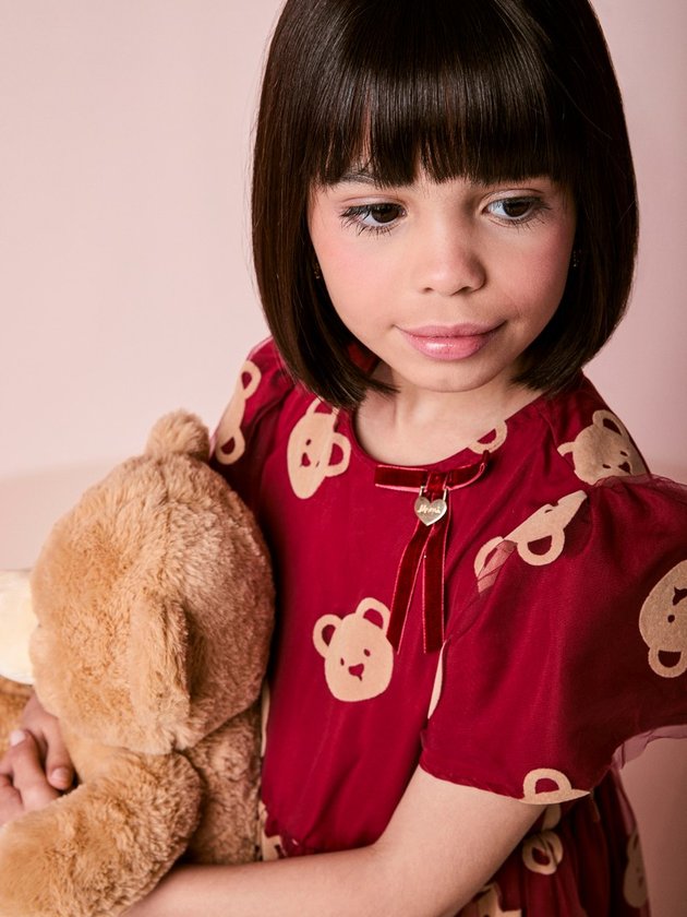 O vestido infantil em tule de ursinhos combina delicadeza e diversão num look que simplesmente rouba a cena. A base confortável recebe uma camada de tule leve, estampado com ursinhos superfofos que criam um efeito de profundidade lindo. As mangas bufantes dão aquele toque romântico que as pequenas amam, enquanto o caimento soltinho garante conforto o dia todo. É uma escolha perfeita para aniversários, celebrações e ocasiões especiais, entregando um visual lúdico, moderno e cheio de personalidade — do jeitinho que as mini fashionistas adoram.