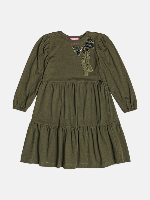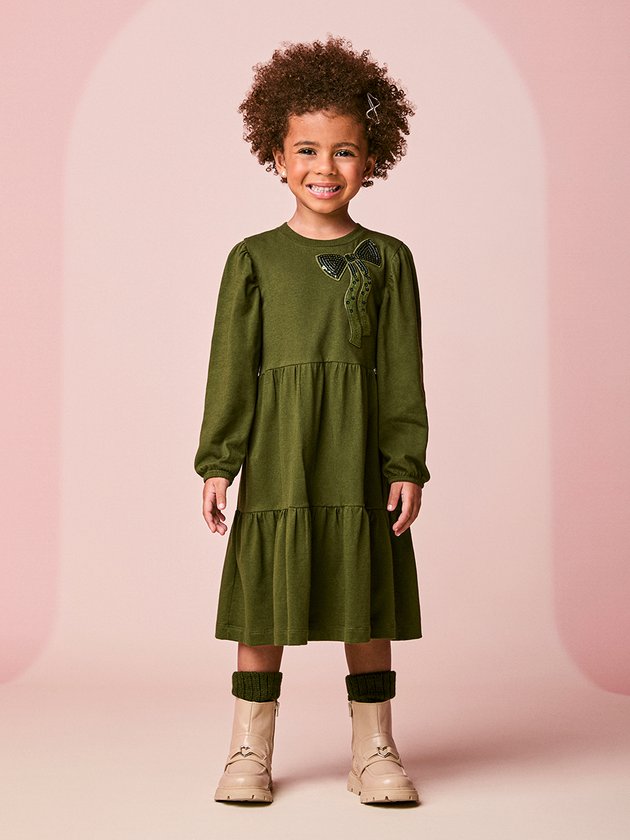 O Vestido Infantil Verde com Laço de Paetê combina minimalismo elegante com detalhes cheios de personalidade. O tom verde escuro cria um visual sofisticado, fácil de usar em várias ocasiões. O destaque fica para o laço aplicado no peito, com paetês que trazem brilho na medida certa, deixando o look festivo sem exageros. A modelagem em camadas adiciona movimento ao vestido, enquanto as mangas longas garantem conforto térmico para dias frescos. Feito em tecido macio, ele oferece toque agradável e liberdade para brincar e se movimentar. Ideal para compor produções estilosas para passeios, fotos, comemorações e até eventos mais arrumadinhos.